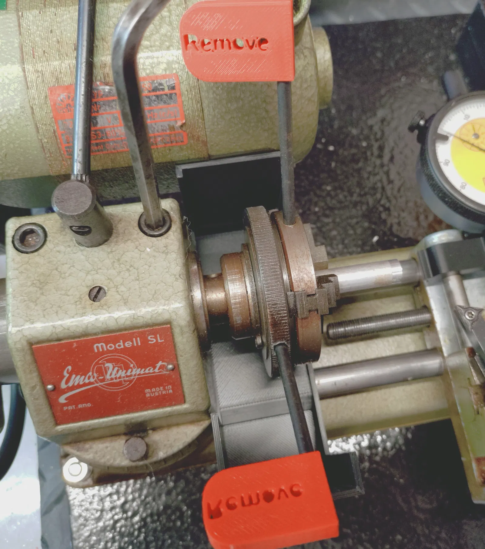 Mẫu cờ cảnh báo/cờ nhắc tháo cho trục 4 mm (đường kính lỗ 4 mm), thường dùng trên các máy tiện mini như Unimat/Emco để dễ nhận biết và tránh quên tháo chi tiết khi vận hành.
