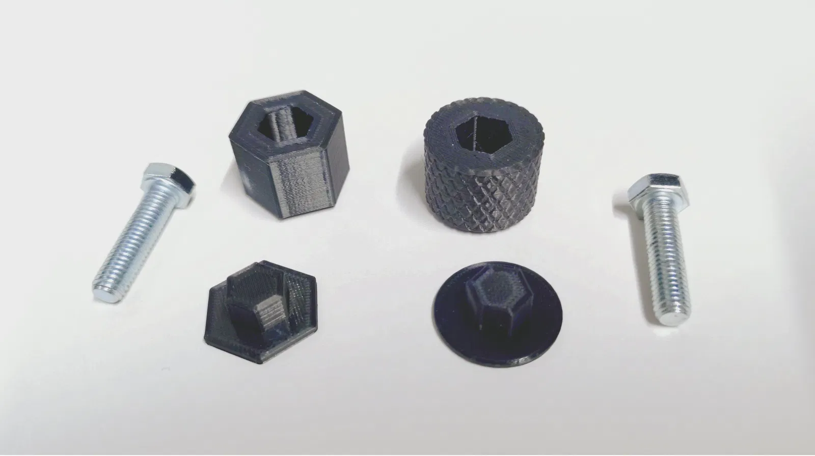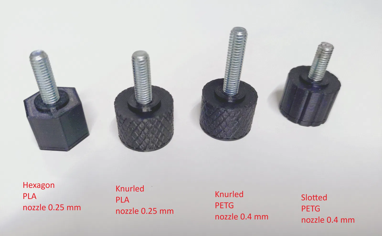 Các núm vặn dạng lục giác, có rãnh và kiểu knurled dùng phổ thông cho vít M5 đầu lục giác. Lỗ lắp được thiết kế dạng interference fit, nên khi ép vít vào cần xoay vít trong lúc nhấn. Đường kính núm danh nghĩa: 18 mm.