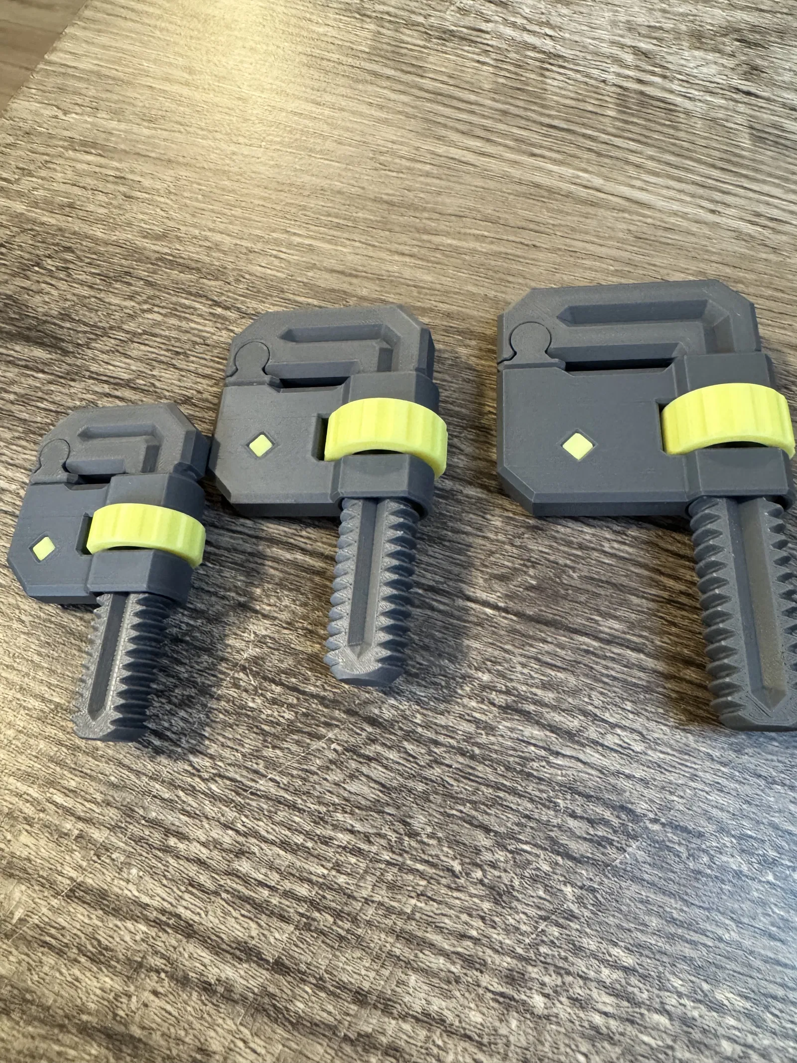 Bộ 3 clamp 3D in nhanh, cứng cáp với PLA, thiết kế print-in-place với hàm kẹp xoay giúp hai hàm luôn song song khi siết chặt. Không cần support, hợp cho đồ gỗ, sửa chữa và lắp ráp.