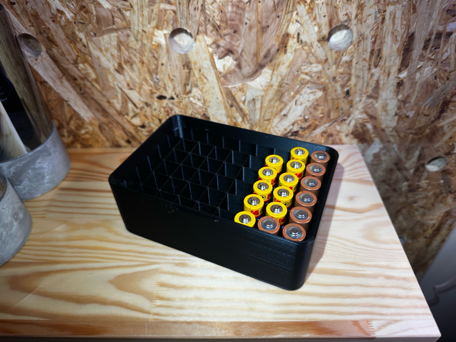 Hộp lưu trữ pin AA thiết kế minimalist với 54 khe riêng lẻ giúp pin đứng thẳng, không lăn và dễ lấy. Kết cấu lưới bên trong cứng cáp, ôm pin chắc chắn; có nắp tùy chọn để chống bụi và xếp chồng.