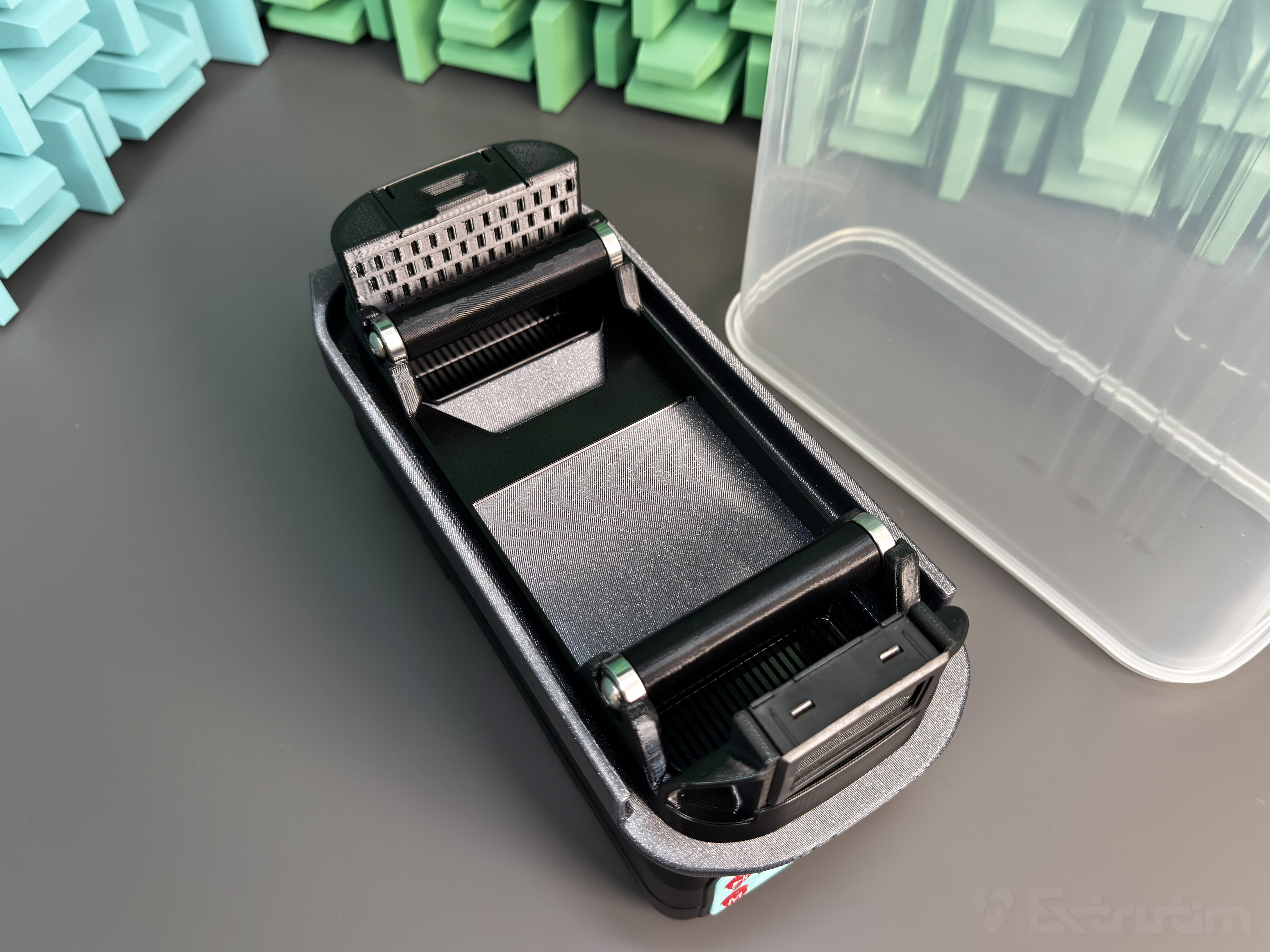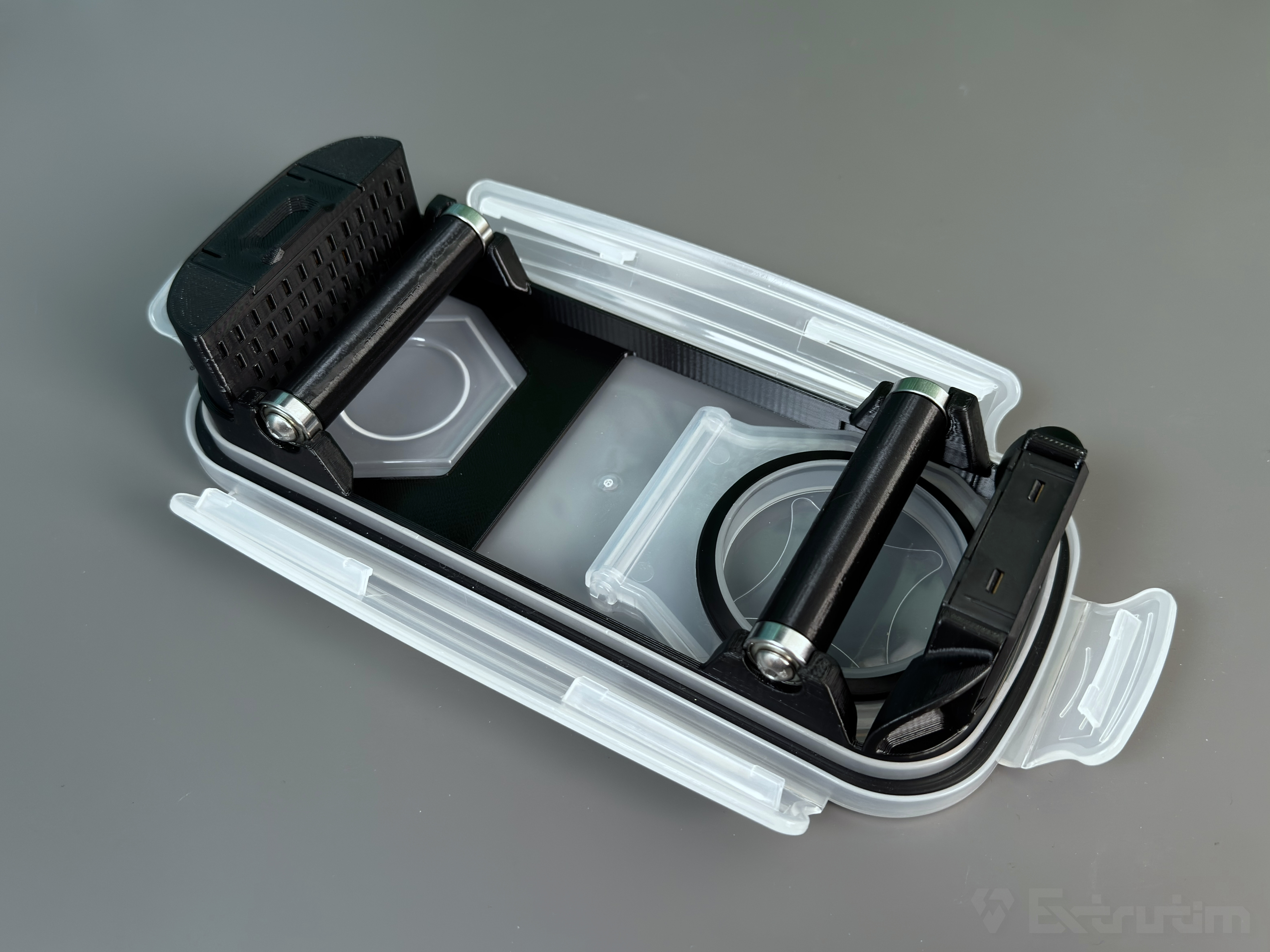 Thay vì chỉnh sửa trực tiếp cái hộp để tương thích Polydryer bằng cách thêm nhiều chi tiết lớn, mình làm một adapter rời. Bạn mở nắp, nhấc phần đế ra khỏi nắp bằng các tay nắm ở bên phải và bên trái của hygrometer, rồi trượt toàn bộ lên adapter.