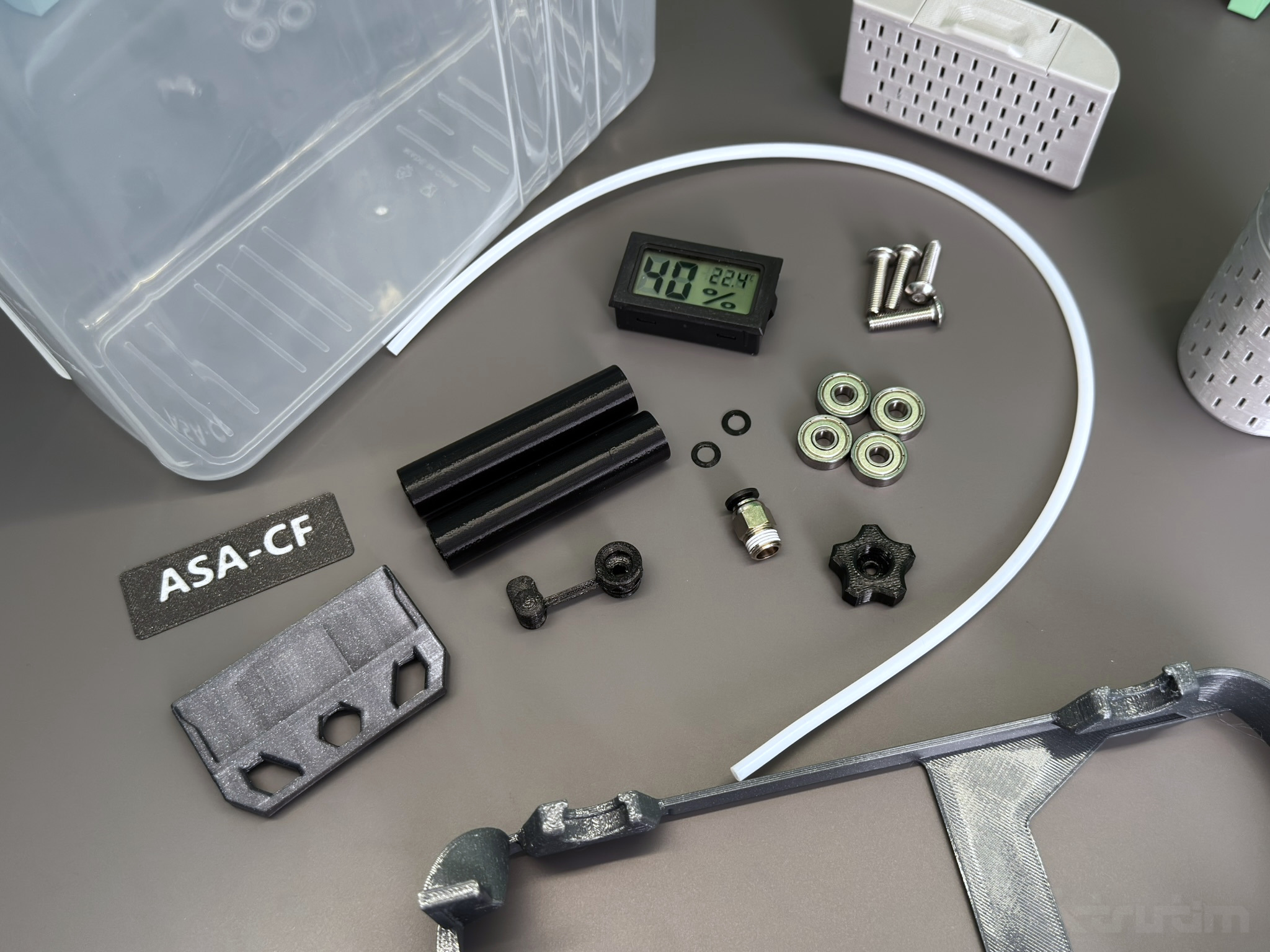 ~90g filament (khuyến nghị PETG/PCTG) +130g cho adapter Polydryer và đồ gá khoan (drilling jig)