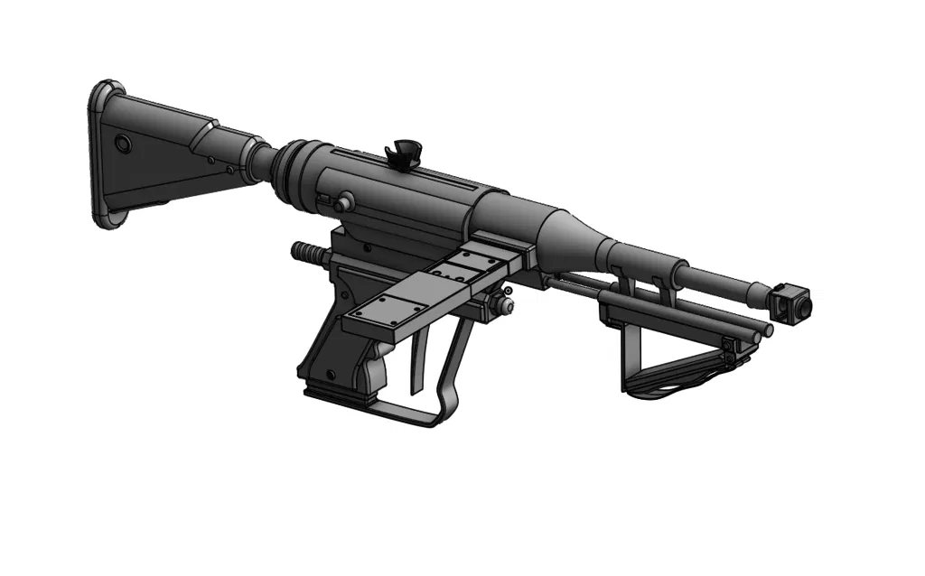 Mẫu STITCHER ARC RADIERS cần vài thanh dowel 1/4 inch để lắp ráp. Có sẵn các add-on cho báng (stock), compensator, angle grip và mag, phù hợp làm props trưng bày.