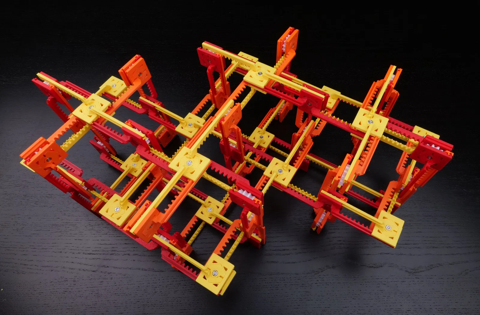 Các chi tiết được thiết kế để in với layer height 0.2mm. Chỉ có half-axles là cần support (nhớ làm sạch toàn bộ support để các chi tiết khớp vào nhau chuẩn). Khi lắp, trước tiên hãy làm 12 “half-junction”, mỗi cái gồm một half-axle, một rack, và một half-cap-half-hex. Rack và half-cap-half-hex sẽ được ấn vào phần đáy của half-axle.