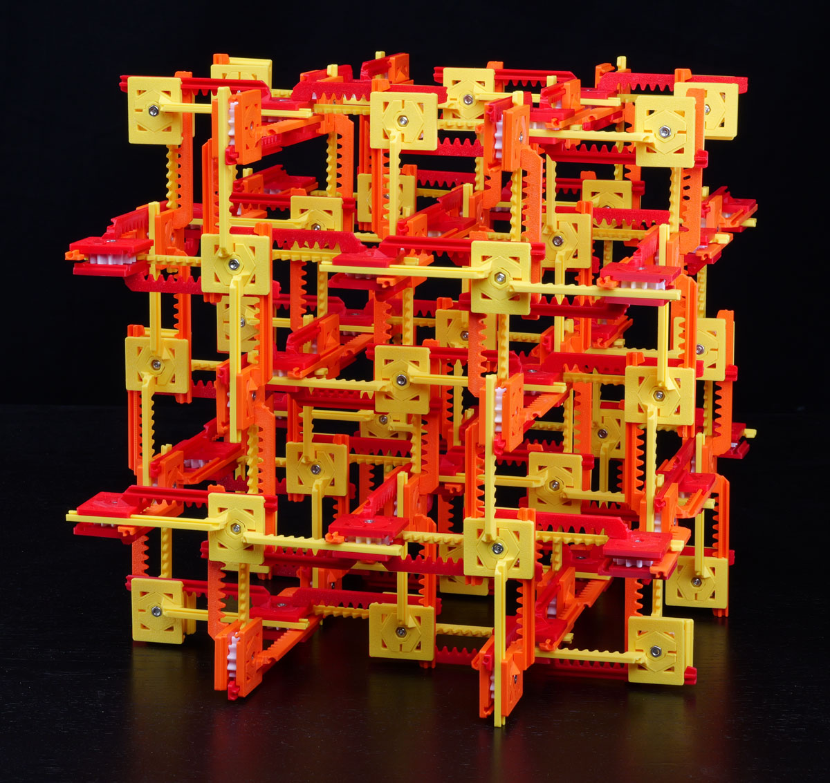 Tiếp theo, mỗi junction sẽ được tạo từ hai half-junction ấn vào nhau, với một gear nằm ở giữa. Tuy nhiên, bạn cần để các rack của những junction kề bên ăn khớp (mesh) với gear của junction này. Hãy luồn (slot) rack của một (half-)junction kề bên vào junction này sao cho khi đặt gear vào, gear sẽ khóa rack đó đúng vị trí. Khi luồn hai half-junction vào nhau, rack của chúng cần có cùng handedness.