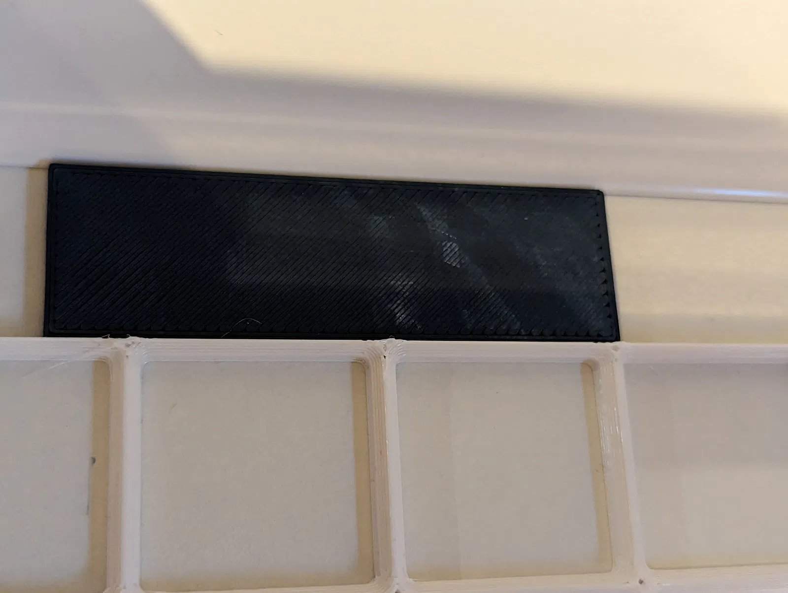 Để canh cho các grid Gridfinity nằm giữa lúc dán xuống, mình làm một cái jig rộng 30.5 mm. Mình tạo một cái box trong prusaslicer/superslicer dài 200mm, rộng 30.5 mm và cao 3 mm, rồi dùng nó để giữ cho grid nằm đúng tâm.