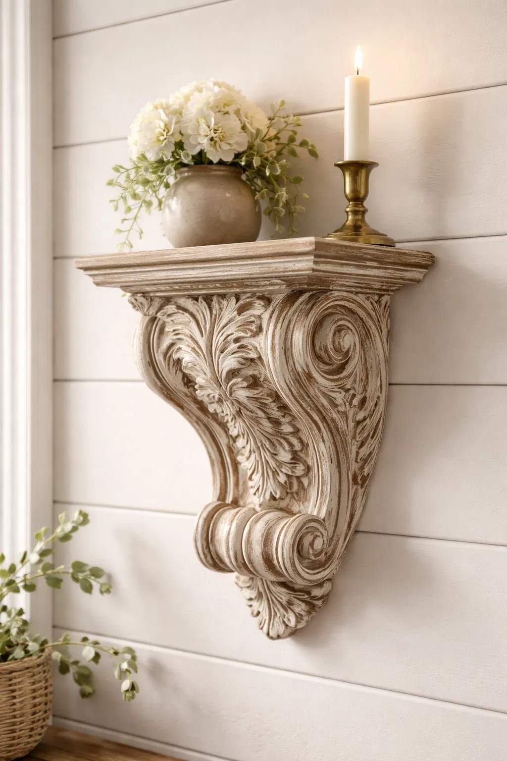 Kệ corbel cuộn phong cách antique dùng làm điểm nhấn trang trí tường cho không gian farmhouse/cottage/vintage. In một khối liền, dễ lắp, hợp sơn, faux-wood hoặc distressed. Chỉ trang trí, không chịu lực.