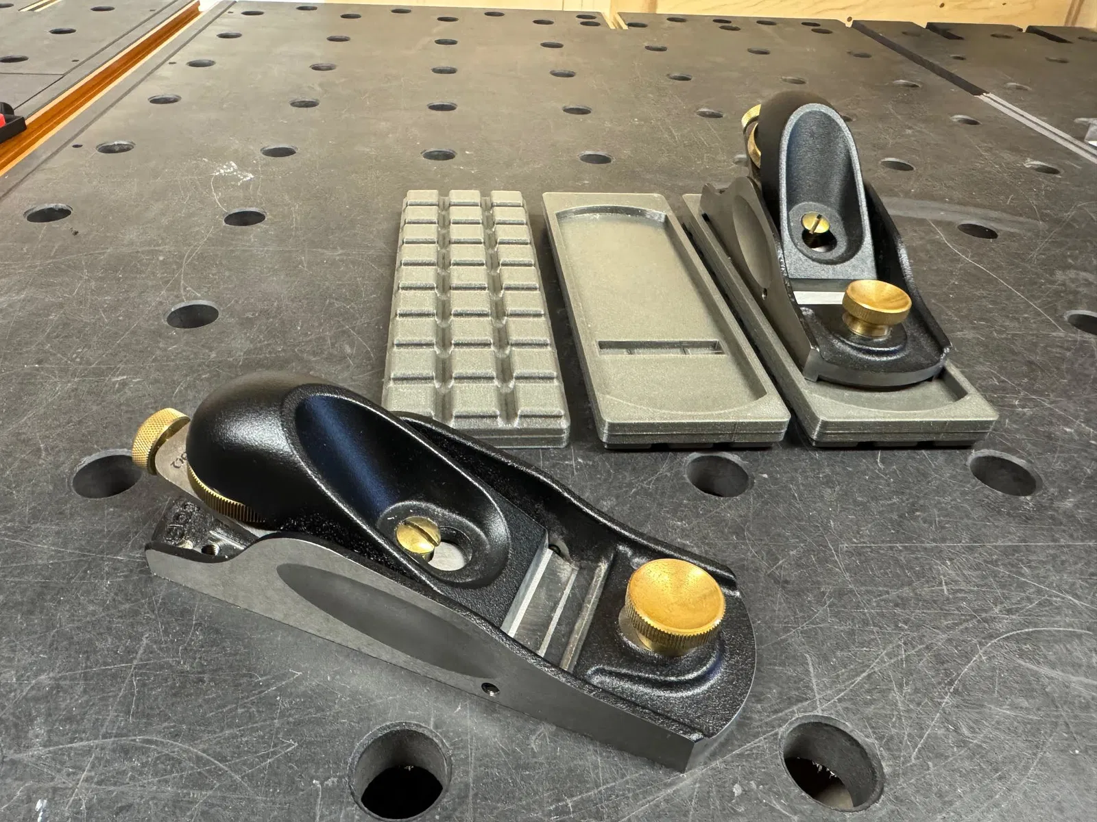 Đây là mẫu đầu tiên của mình: một khay lưu trữ tương thích Gridfinity cho Veritas block plane. Dòng này có vài kích cỡ, nên bạn nhớ xem ảnh để kiểm tra cái của bạn có đúng loại này không. Mình làm phần profile thấp để dễ nhấc lên, đồng thời vẫn giữ footprint nhỏ. Vì vậy phần grid cũng làm dạng nửa-size.