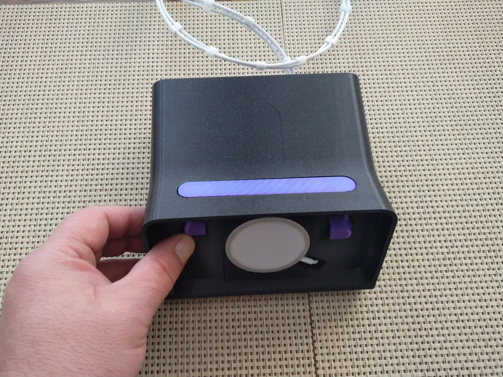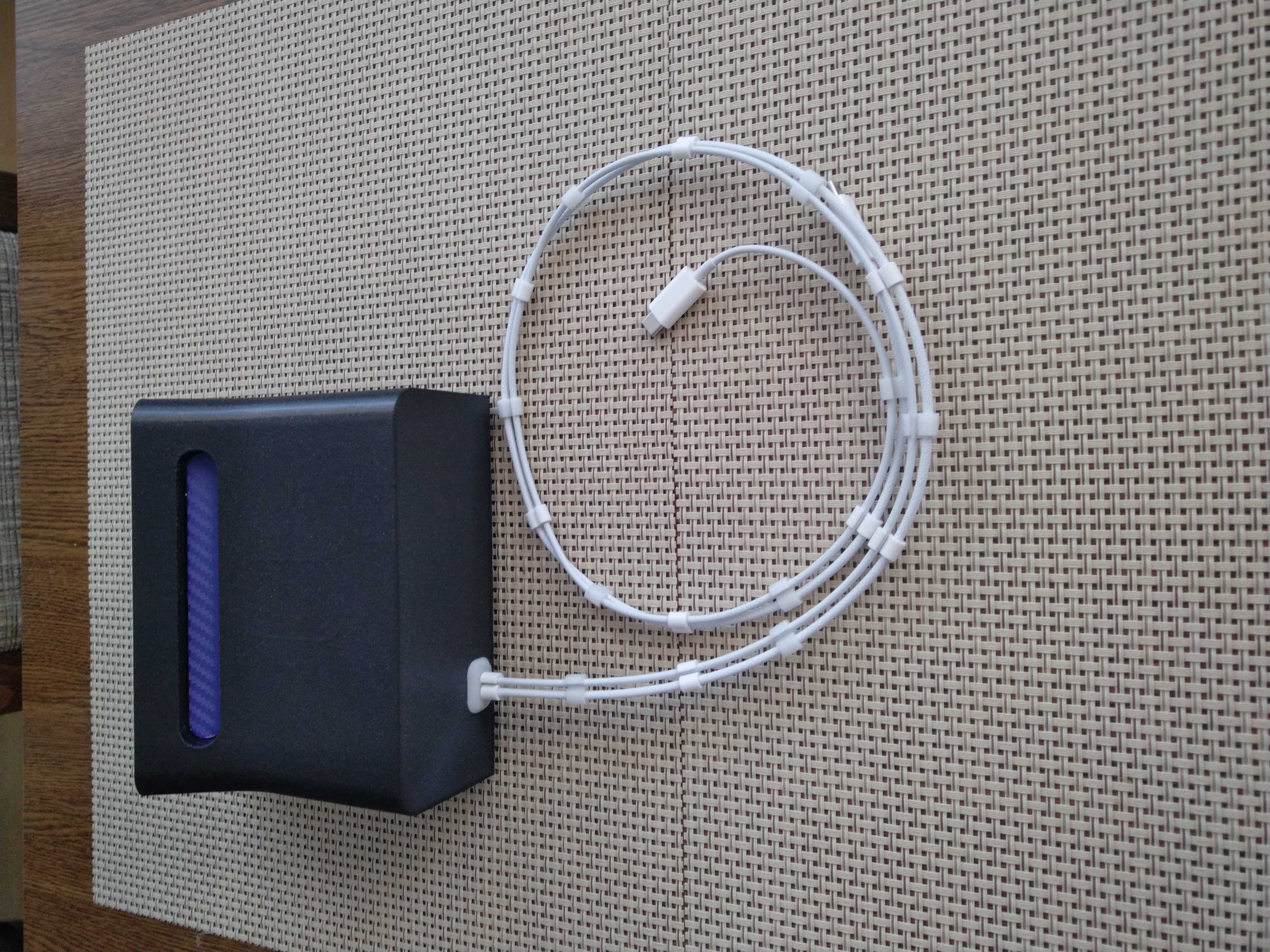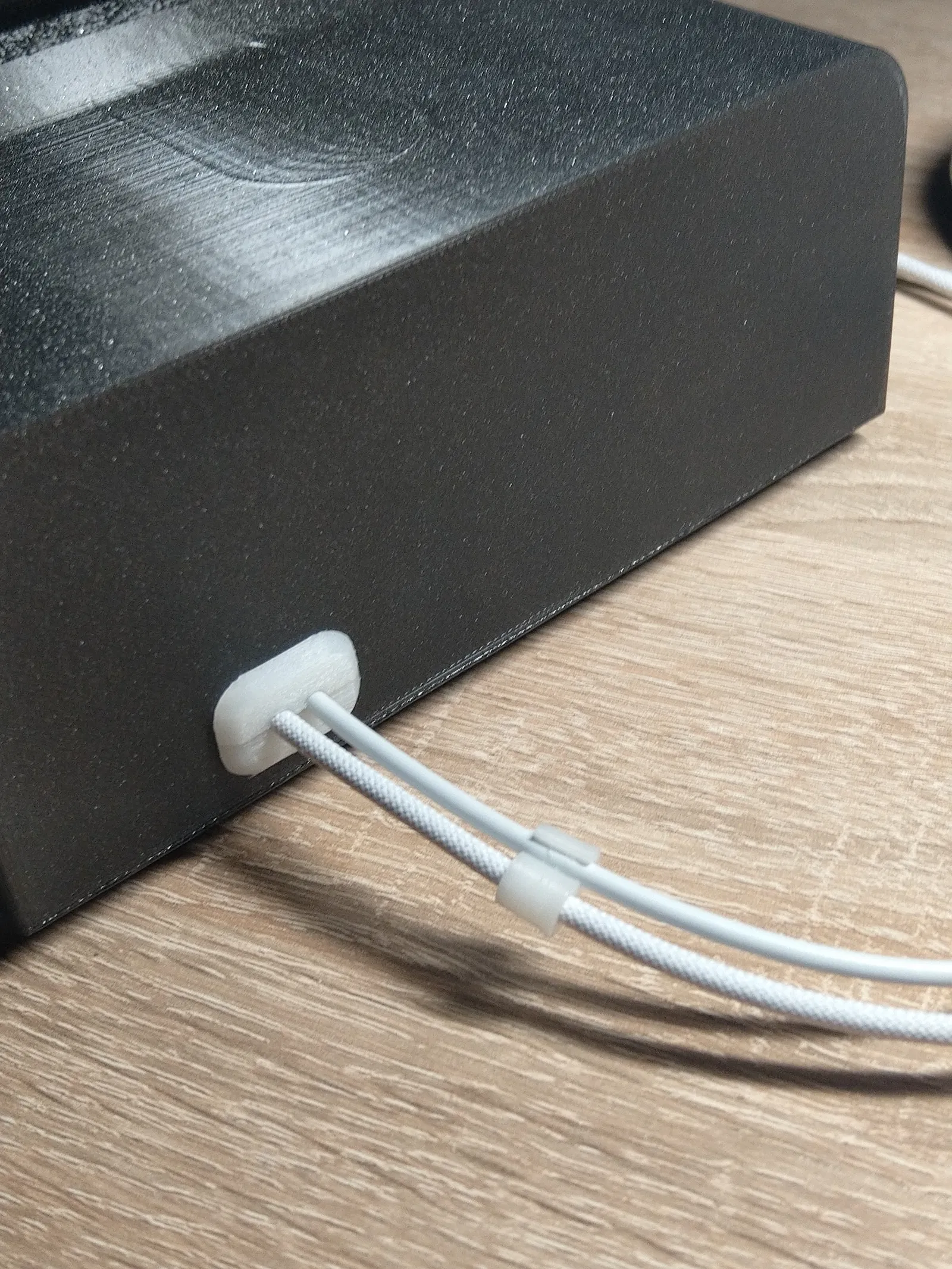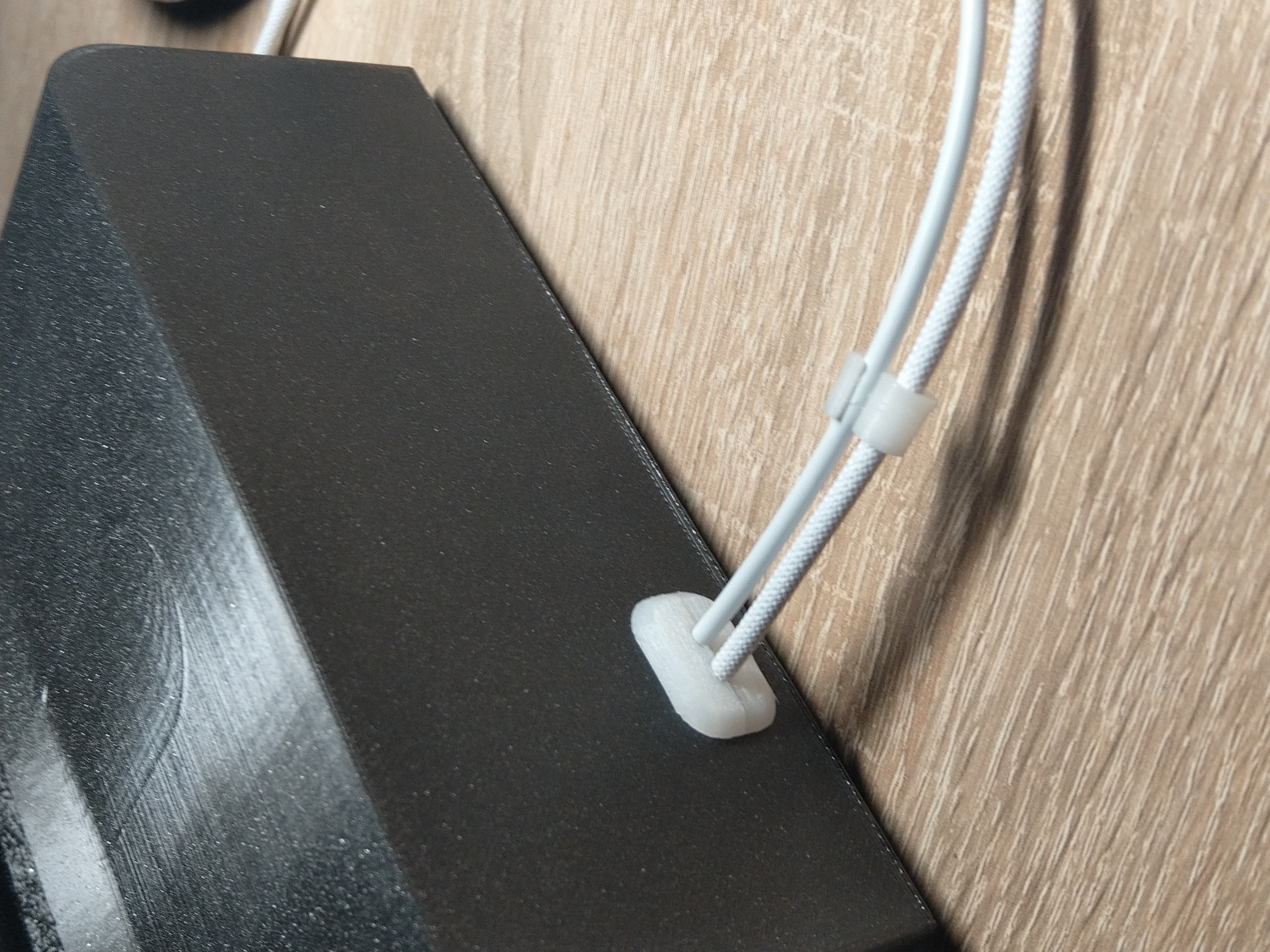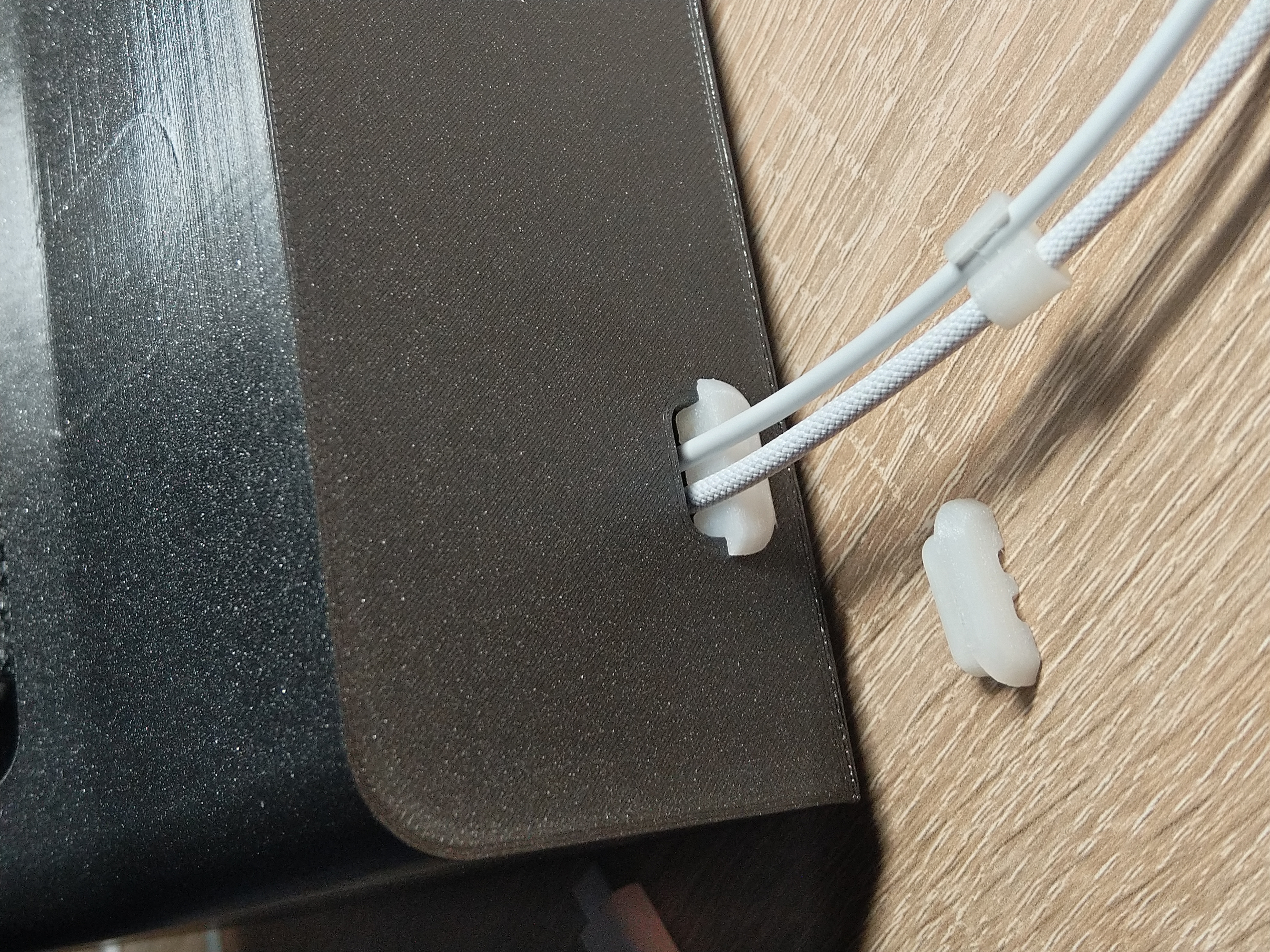 Mọi thứ đều chính xác. Chỉ có phần sạc nhỏ hơi mỏng, nên mình làm thêm một cái nêm để chèn/đẩy cho nó sát bề mặt nhất có thể. Ngoài ra mình làm thêm một gioăng/ống luồn (TPU) ở phía sau cho 2 sợi cáp. Mình cắt gioăng này ra làm 2 phần trong slicer, lắp vào rất ổn và nó giữ cáp chặt đúng vị trí. Tiếp theo mình tạo thêm các khớp nối cáp để dây không bị lỏng quá. Có 2 phiên bản: TPU và PETG. Cả hai đều hoạt động hoàn toàn bình thường. Trong ảnh của mình thì có hơi nhiều cái khớp nối, nhưng mình lười vứt đi. In bằng Ultrafuse 85A, core one +, nozzle 0.4, layer 0.1.