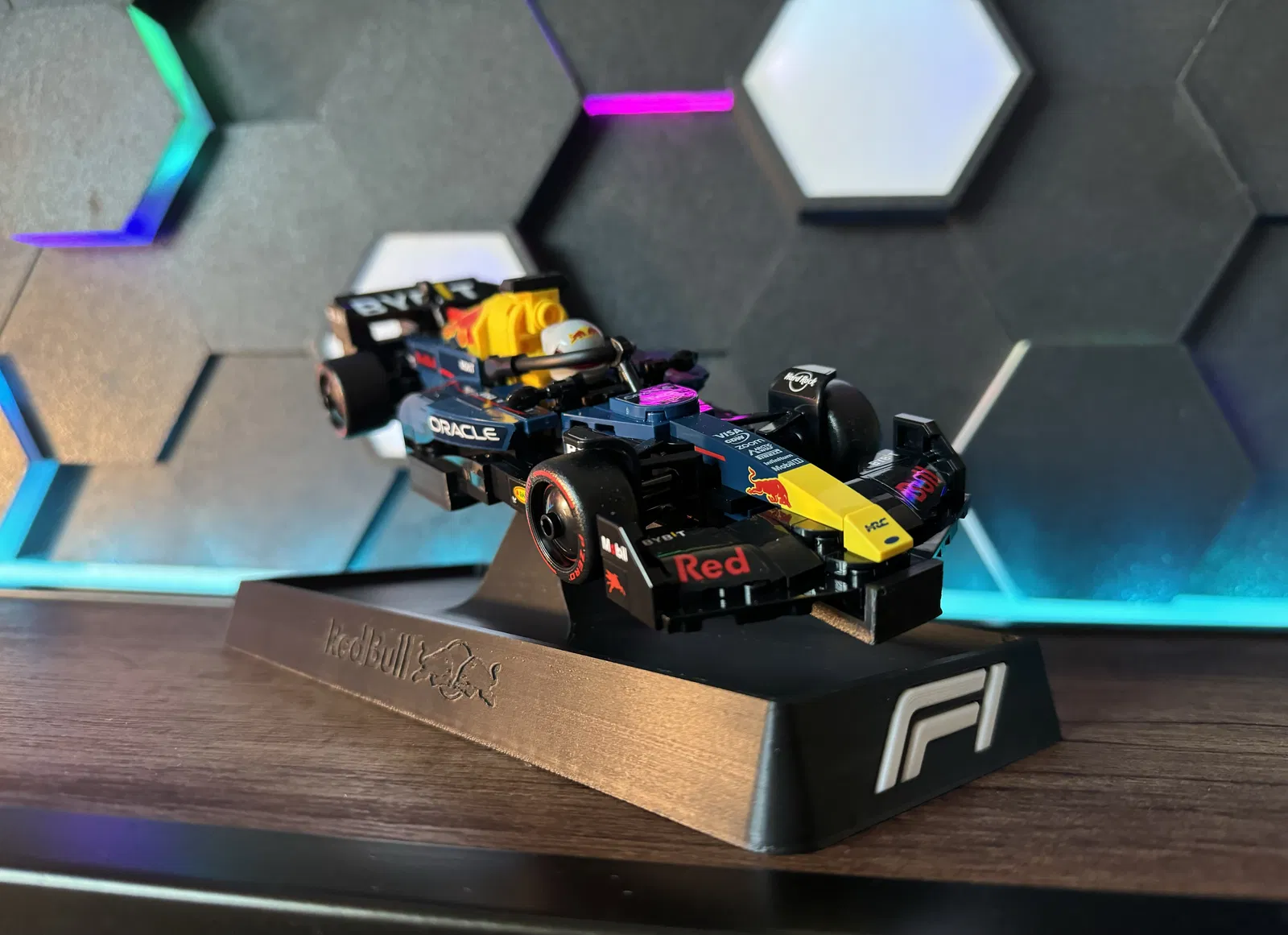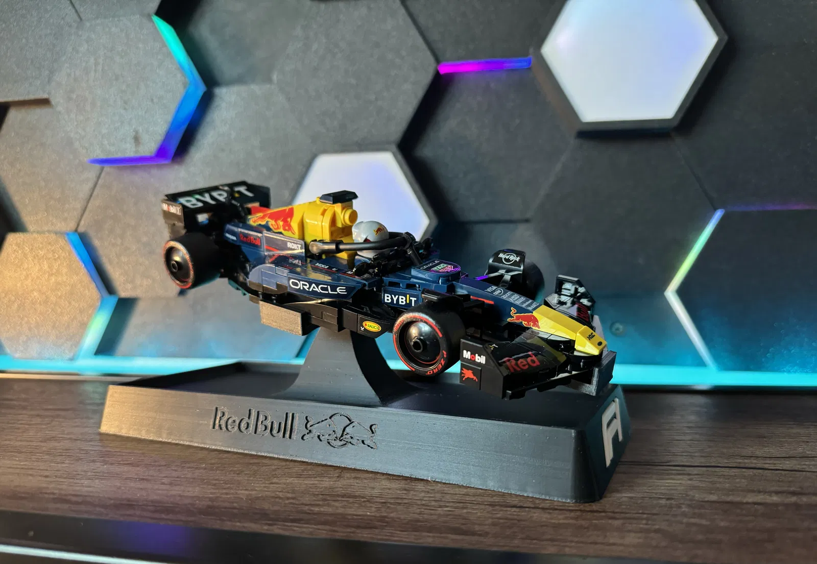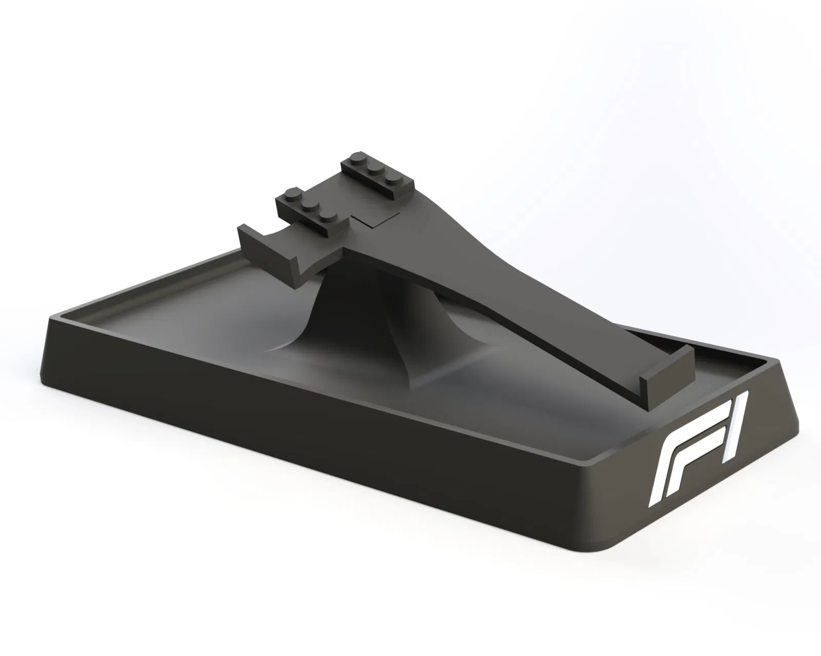 Kệ trưng bày cho các bộ Lego F1 Speed Champions, có bản “plain” in logo F1 và bản có tên/logo Red Bull. Thiết kế hỗ trợ trưng bày dựng đứng hoặc đặt nghiêng, với góc pitch ~10°, roll ~15°, yaw ~5°.