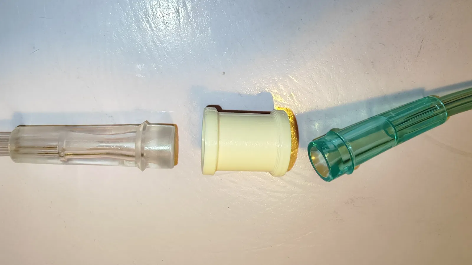 Tôi dùng máy tạo oxy (oxygen concentrator) vào ban đêm để kiểm soát chứng ngưng thở khi ngủ. Vì mấy thiết bị này khá ồn và dễ làm mất ngủ, nên tôi dời nó sang phòng kế bên. Đầu nối ống oxy này dùng để nối một ống nối dài oxy dài 7 mét với ống thở mũi (nasal cannula). Để giảm tối đa lực cản dòng khí, thay vì nhét một ống vào bên trong ống còn lại, tôi dùng một đầu nối trượt phủ lên mép ngoài của các đầu fitting; khi lắp vào thì các fitting sẽ “click” khóa lại.