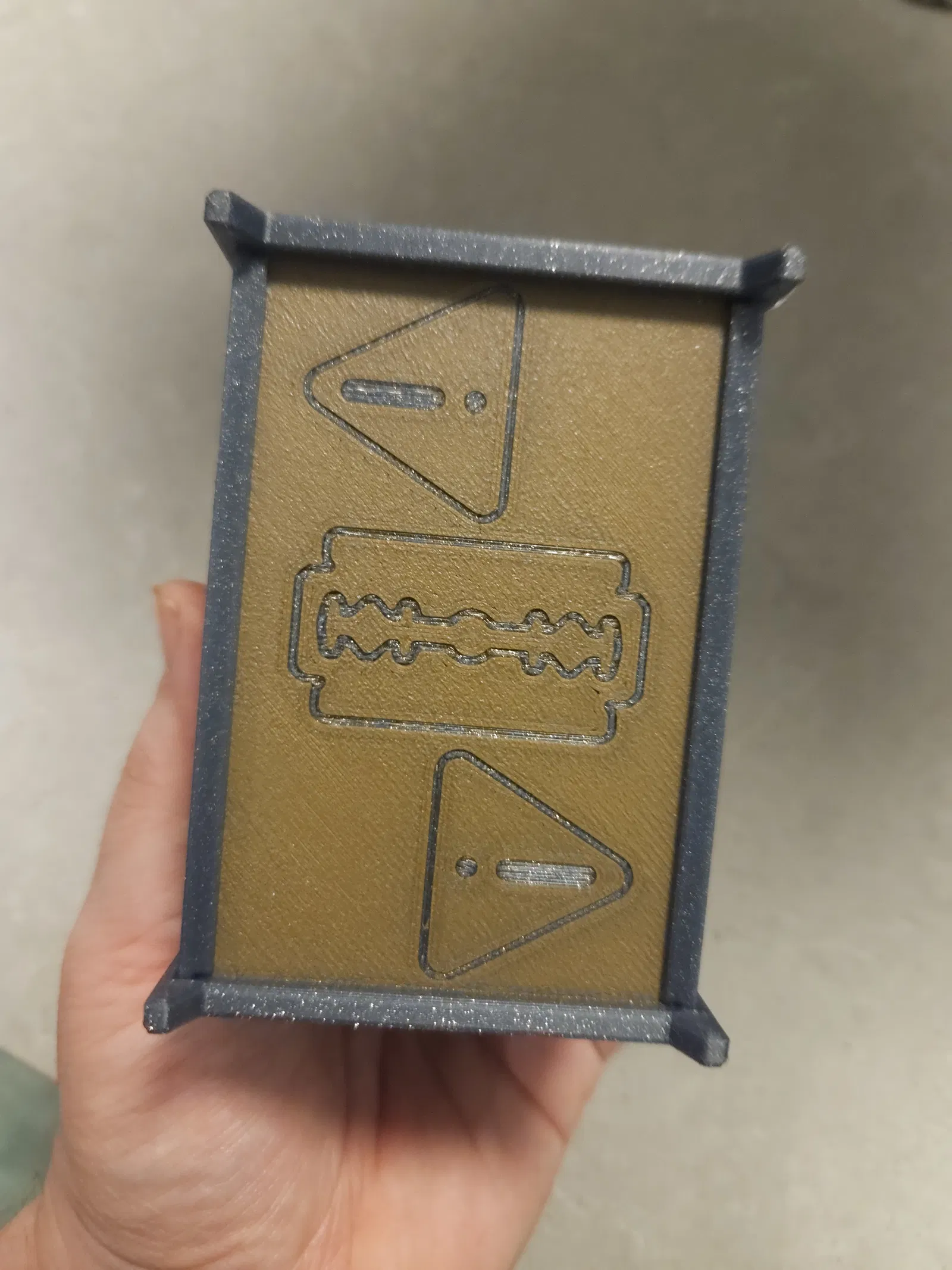 Vậy là… mình thiết kế một cái hộp kiểu rương để bỏ lưỡi dao cạo đã dùng cho an toàn. Phần khung chỉ cần bấm cái là vào khớp, không cần keo luôn.