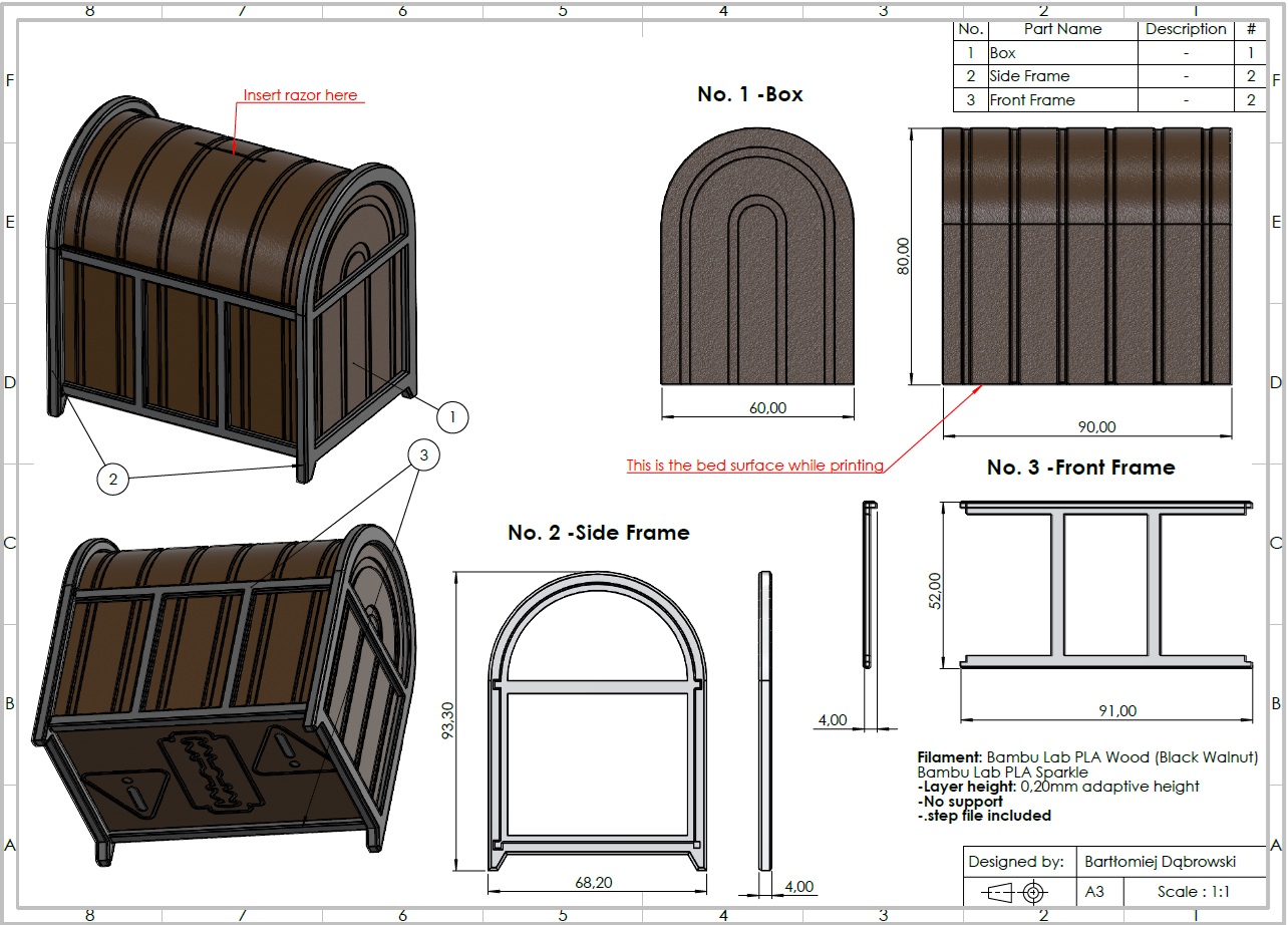 Hộp dạng rương dùng để bỏ lưỡi dao cạo đã dùng cho an toàn. Thiết kế nhiều phần, khung bấm khớp nên không cần keo. Có pictogram mặt dưới để in multimaterial bằng AMS/MMU hoặc dừng in đổi filament thủ công.