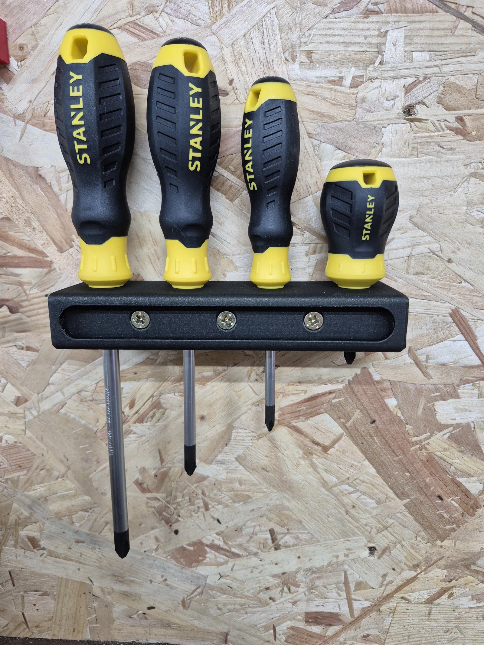 Mẫu giá đỡ tua vít Philips thiết kế custom, có thẻ (tag) tháo rời và tùy biến, trượt vào dễ dàng. Phần ốc được giấu để tạo cảm giác “lơ lửng”, phối màu theo tông Stanley. In PLA, infill 20%.