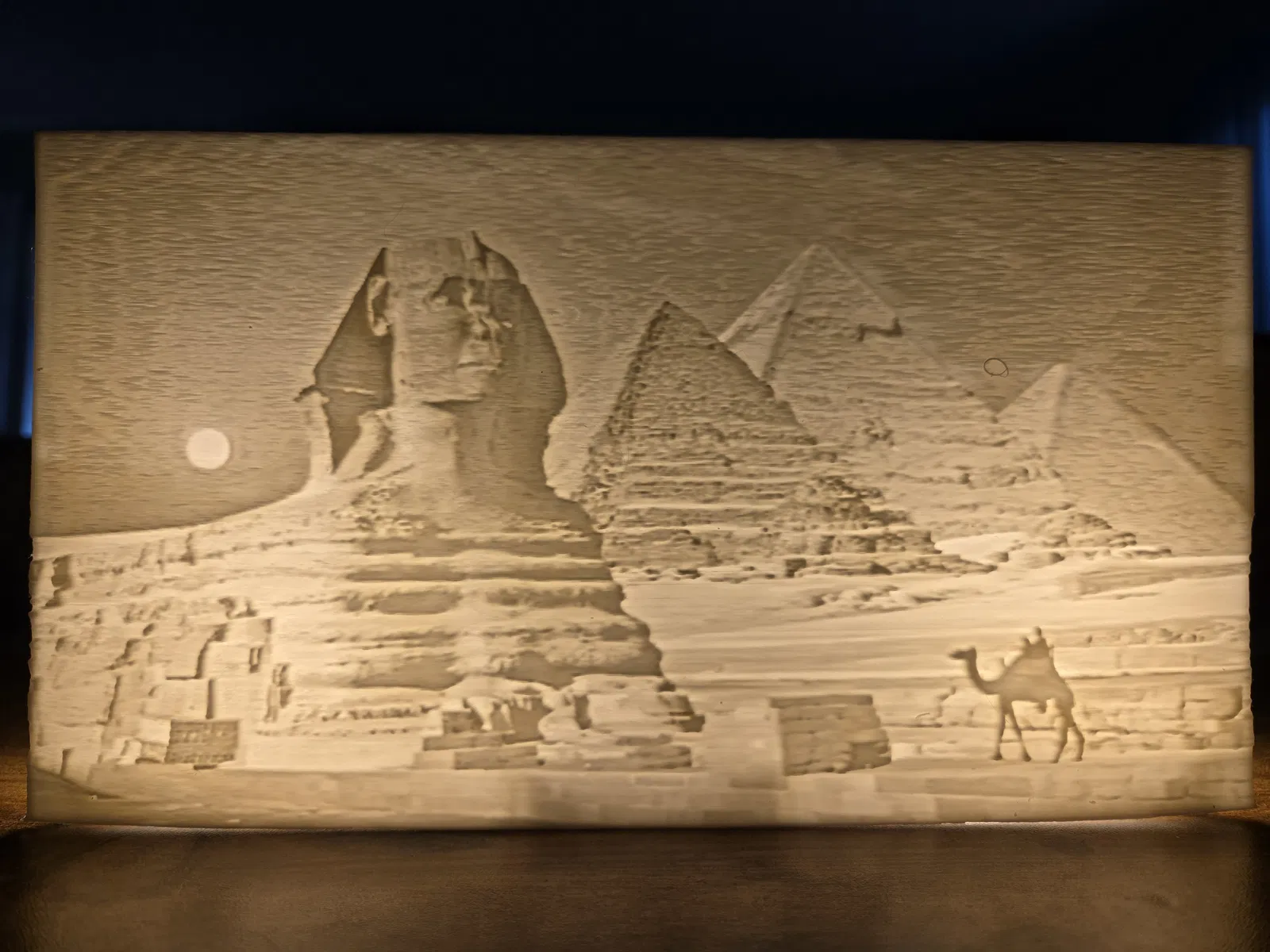 Lithophane tái hiện Kim Tự Tháp Giza và tượng Nhân Sư theo dạng phù điêu, hợp làm đồ trang trí hoặc học tập về kiến trúc Ai Cập cổ. Nên in độ phân giải cao, dùng filament màu sáng để lên hiệu ứng ánh sáng đẹp.