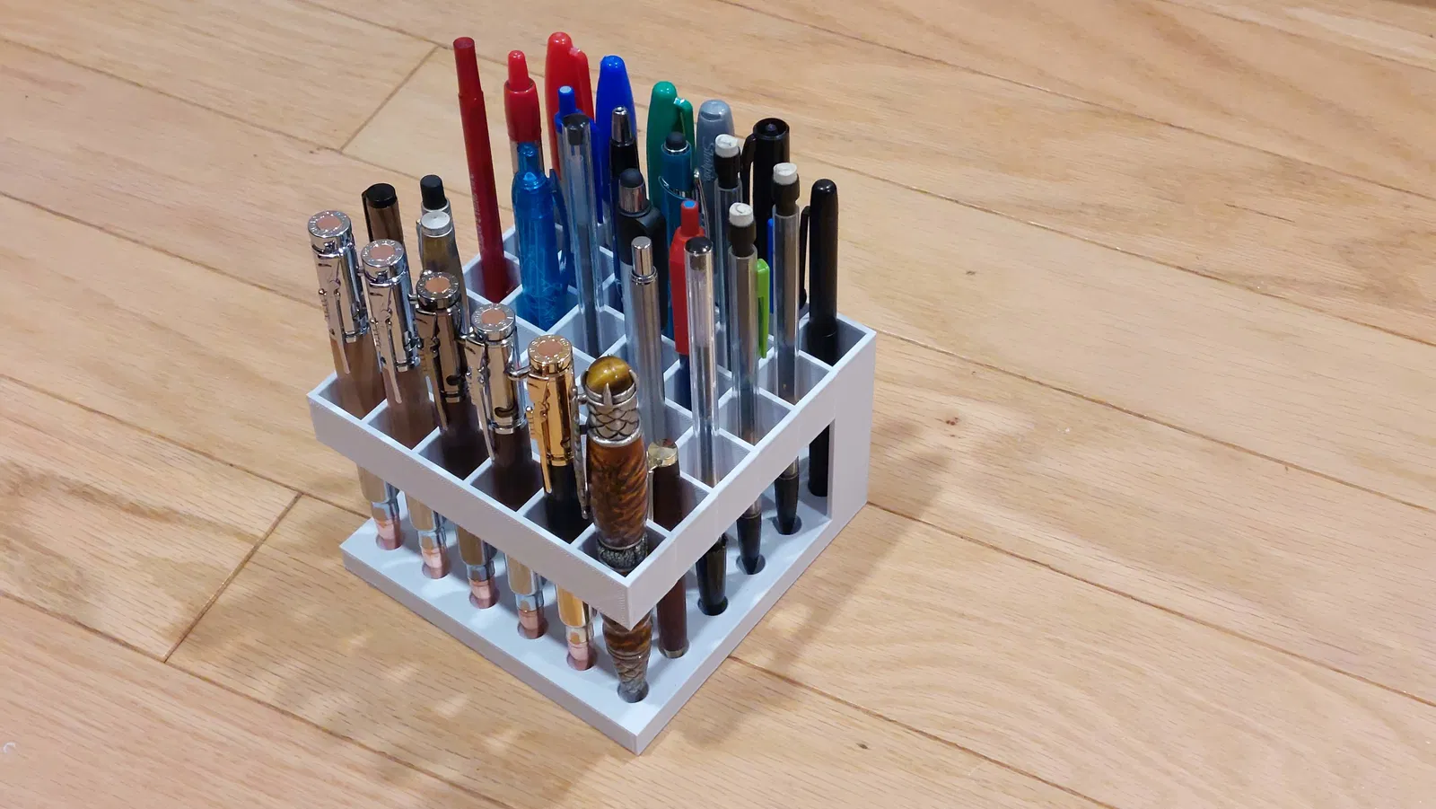 Mình thích bản in nằm ngang (side print) hơn để khỏi cần supports che tầm nhìn, nhìn đồ viết của bạn cũng rõ hơn. Khay này đựng được mọi thứ có bề ngang nhỏ hơn 18mm.
