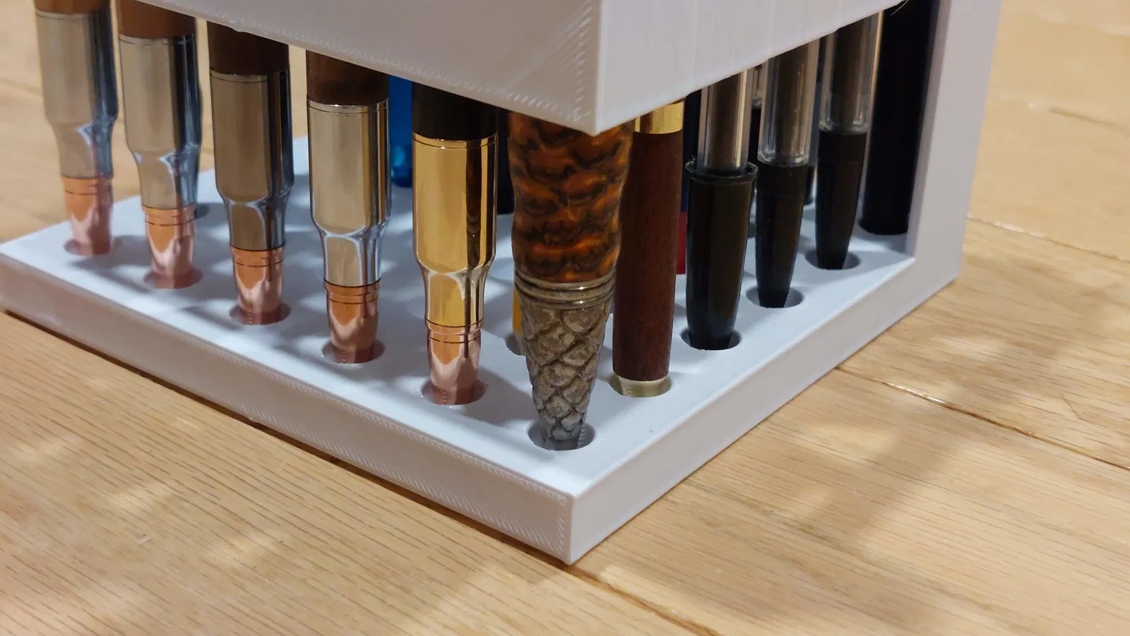 LƯU Ý!!! — Nếu bạn chọn in làm 2 nửa thì nhớ dùng keo siêu dính (super glue) để dán lại, nếu không phần trên có thể bị bật ra do sức nặng của bút/viết chì loại nặng (vì có người dùng đồ viết rất nặng). Mà chẳng ai thích làm rớt mấy cây marker, bút, hay viết chì đắt tiền xuống sàn đâu!!!