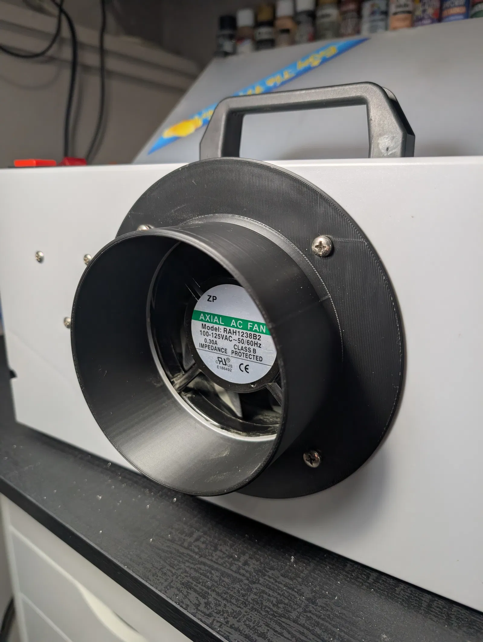 Mình đã in mẫu airbrush filter của Termiman nhưng nó không vừa với booth của mình, nên mình tạo cái adapter này để gắn vào. Kích thước ngoài của ống là 122.8mm. Các lỗ vít để bắt vào booth cách nhau 148mm.