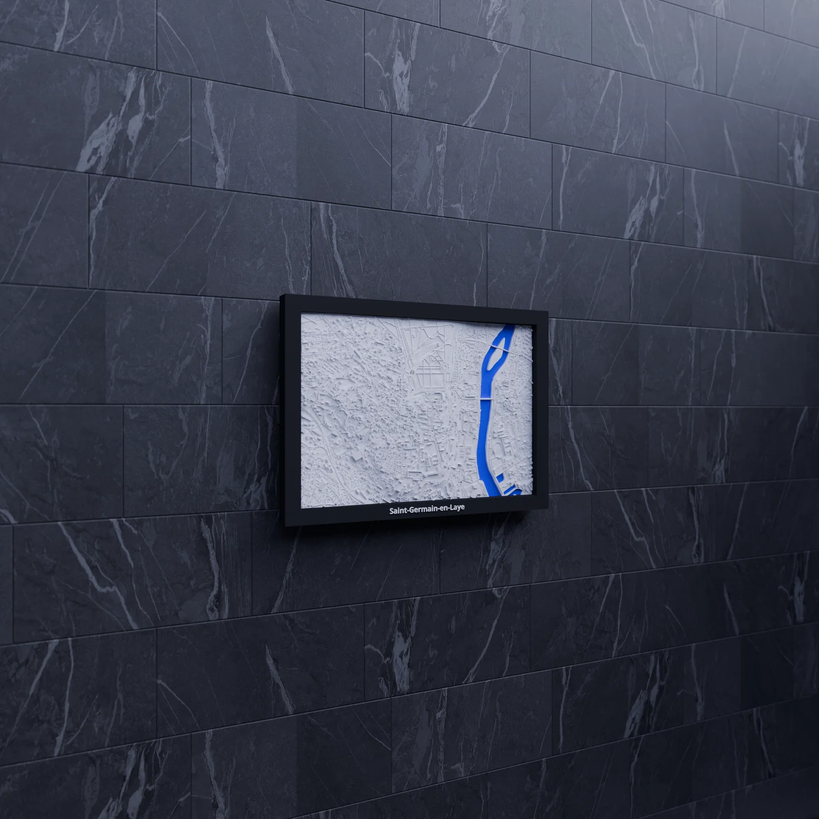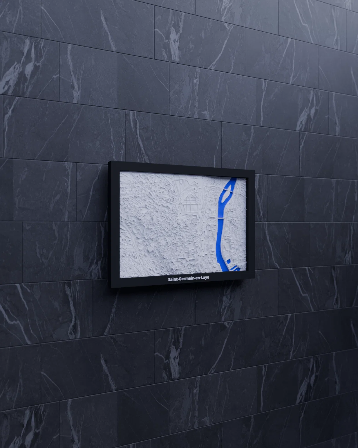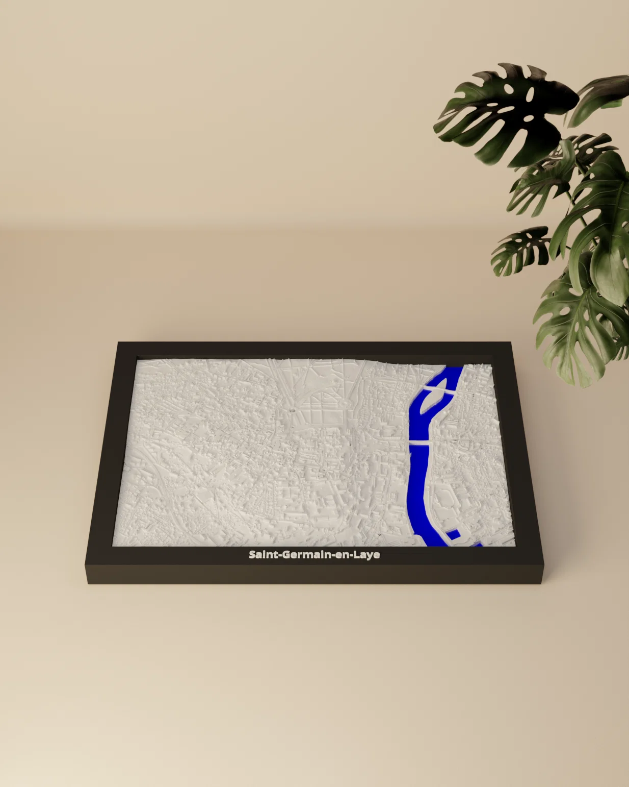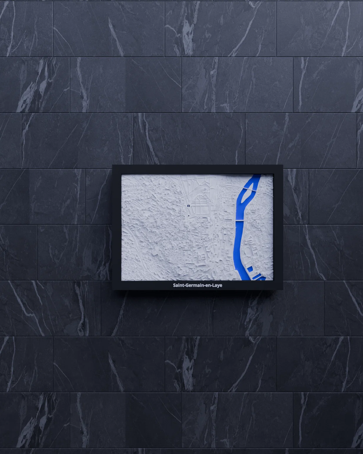 Mô hình địa hình (topographic) 3D thu nhỏ Saint-Germain-en-Laye, Pháp, dựng từ dữ liệu địa lý. Tỷ lệ ~16535:1, kích thước 170.5 × 119.5 mm, kèm nhiều frame có lỗ treo, phù hợp in PLA.