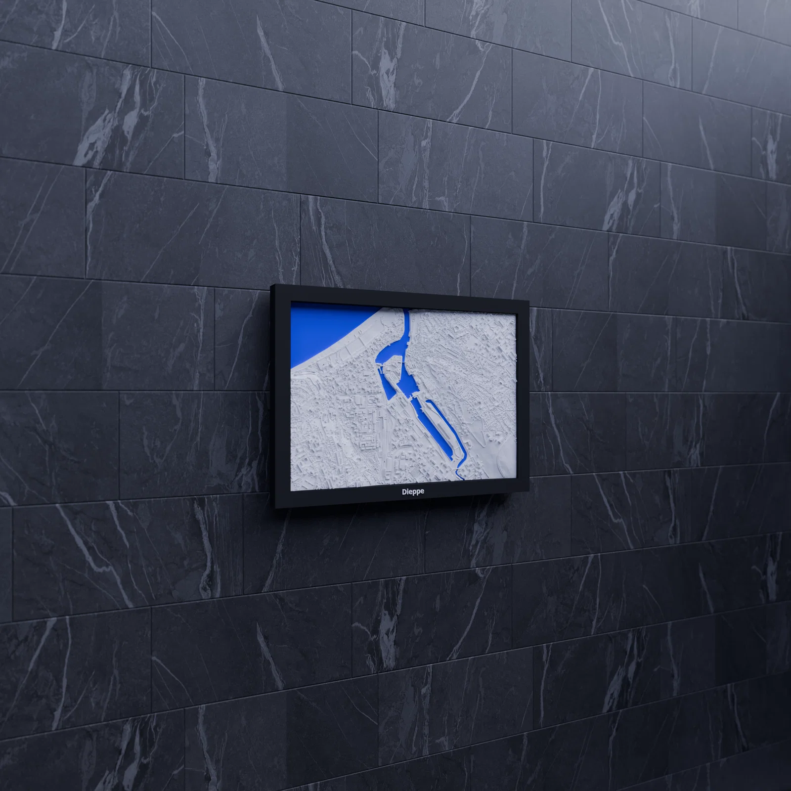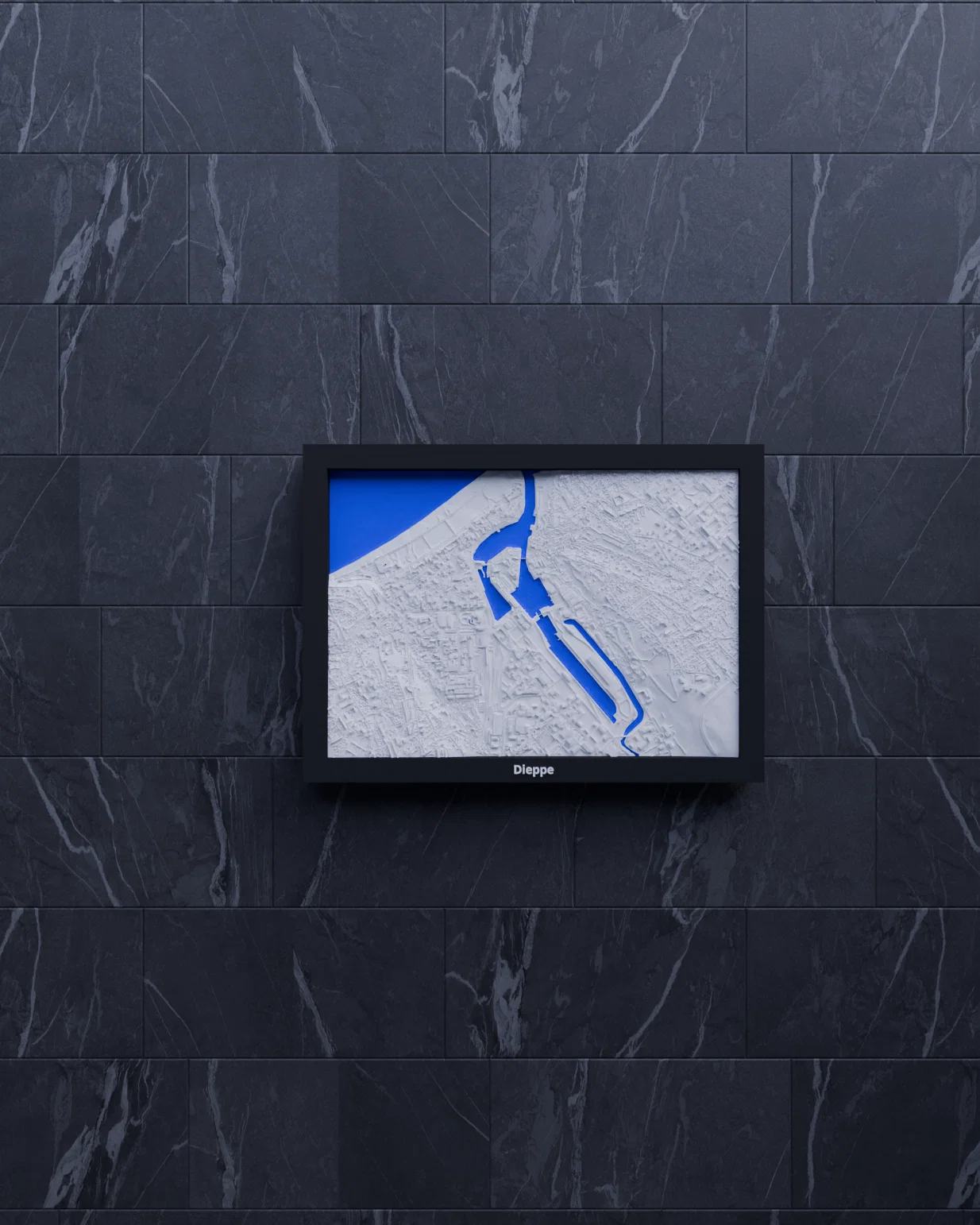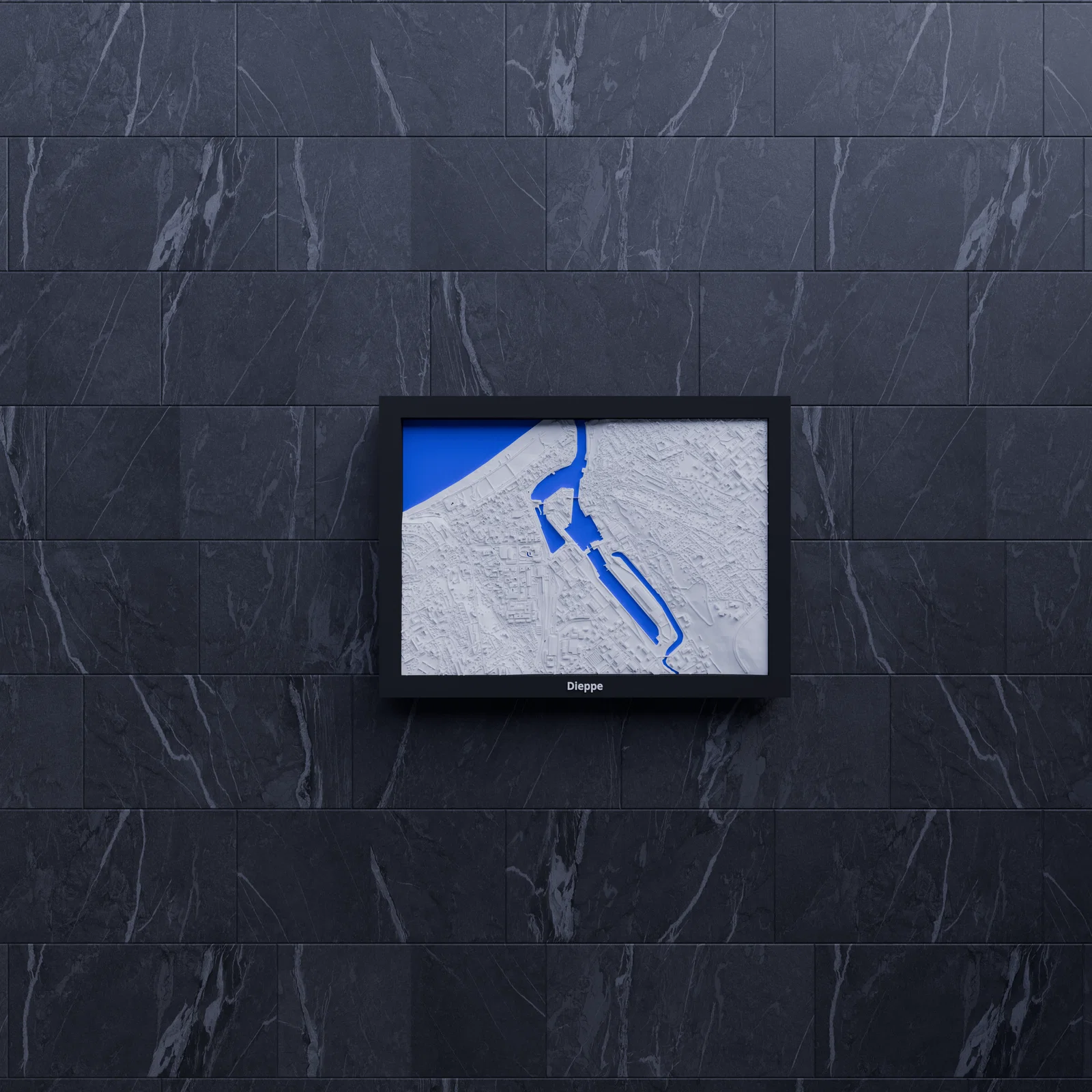 Mô hình địa hình thu nhỏ Dieppe (Pháp) có thể in 3D, dựng từ dữ liệu địa lý quanh tọa độ 49.923, 1.086. Kích thước 170.5 × 119.5 mm, có nhiều lựa chọn khung kèm lỗ treo, phù hợp trưng bày hoặc học tập.