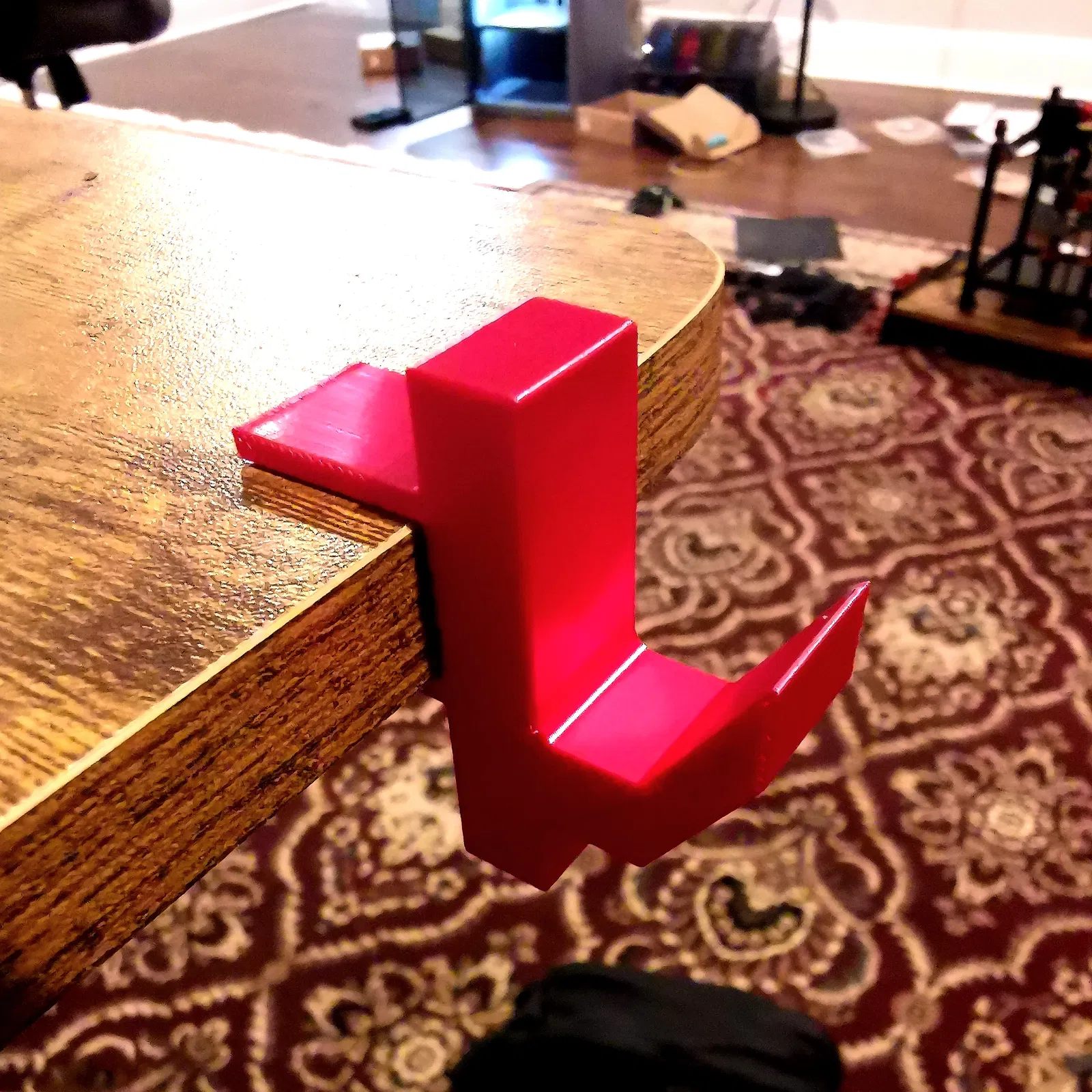Mẫu Hook dùng để gắn vào mặt bàn dày 15mm. Gợi ý in: layer height 0.2 hoặc 0.1, 2 walls, infill 20–50% tuỳ trọng lượng đồ treo, và không cần supports.
