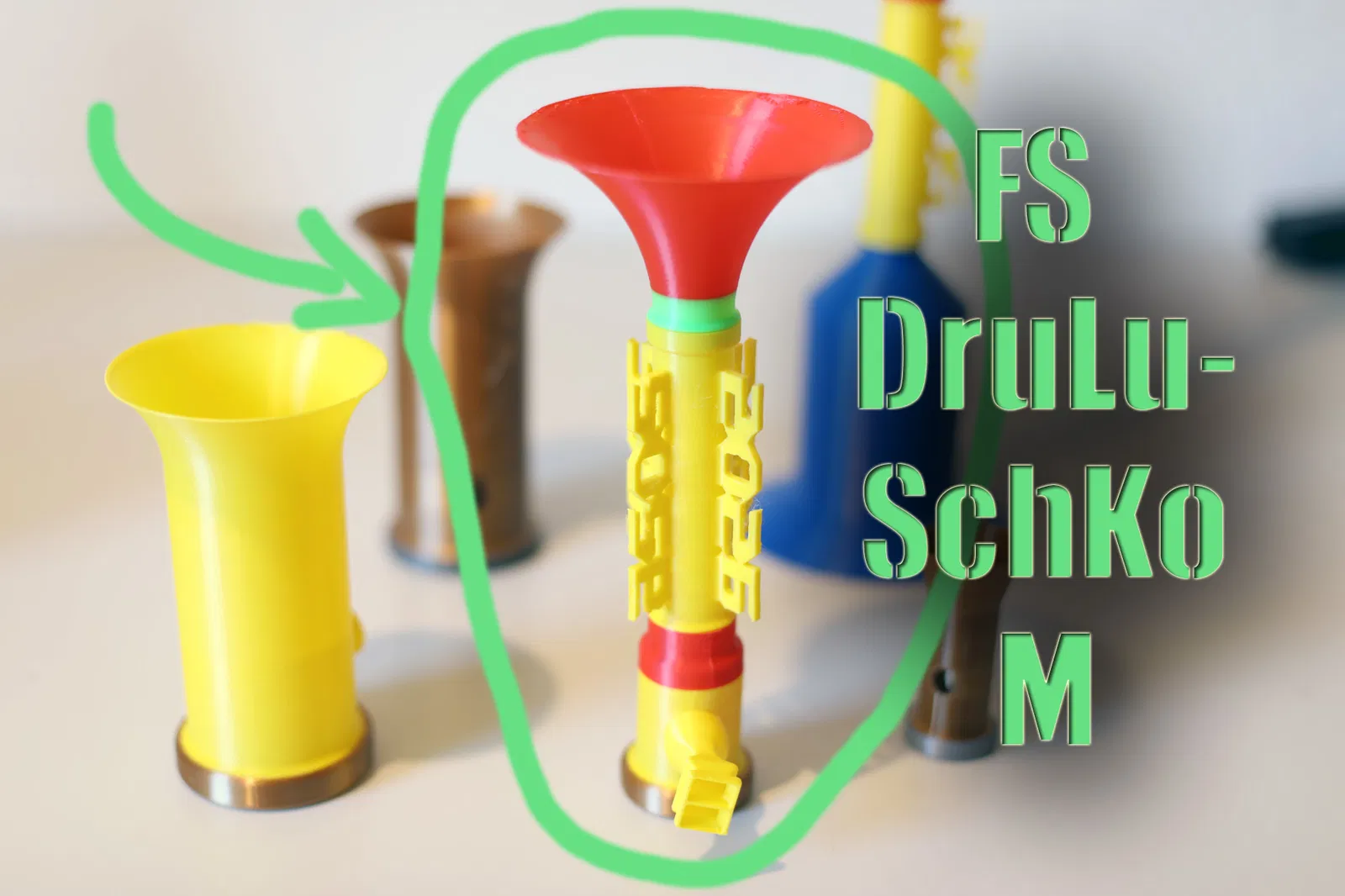 DruLuSchKo cỡ M (Compressed Air to Sound Converter) tạo âm trung, in 3D được toàn bộ và khá lớn tiếng. Có nhiều lựa chọn Körper_außen/innen, Membran 0,2–0,4mm (TPU), Zwischenteil/2026 và hướng dẫn in – lắp.