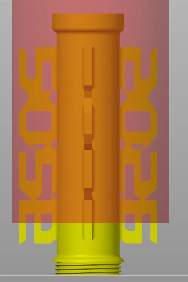 Với chi tiết có đầu nối để gắn “Mundstück”, tiếc là khó tránh khỏi phải dùng support. Các phần còn lại có thể in không cần support. Tuy nhiên, đôi khi để lại support nhỏ cũng hữu ích. “Zwischenteil_2026” cũng cần support phía dưới phần chữ. Lên cao hơn thì có thể bỏ, như trong hình minh hoạ dùng support blocker.