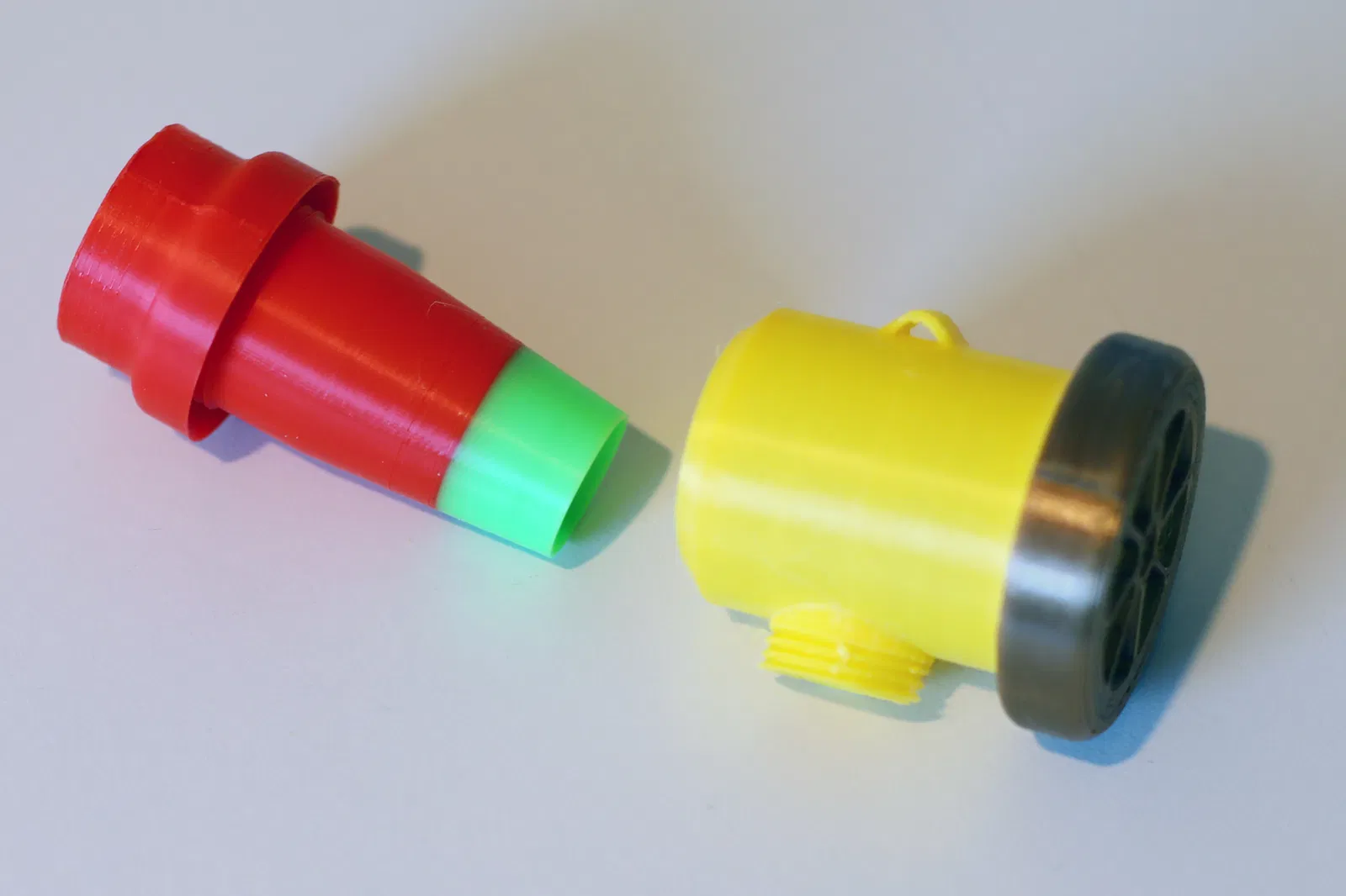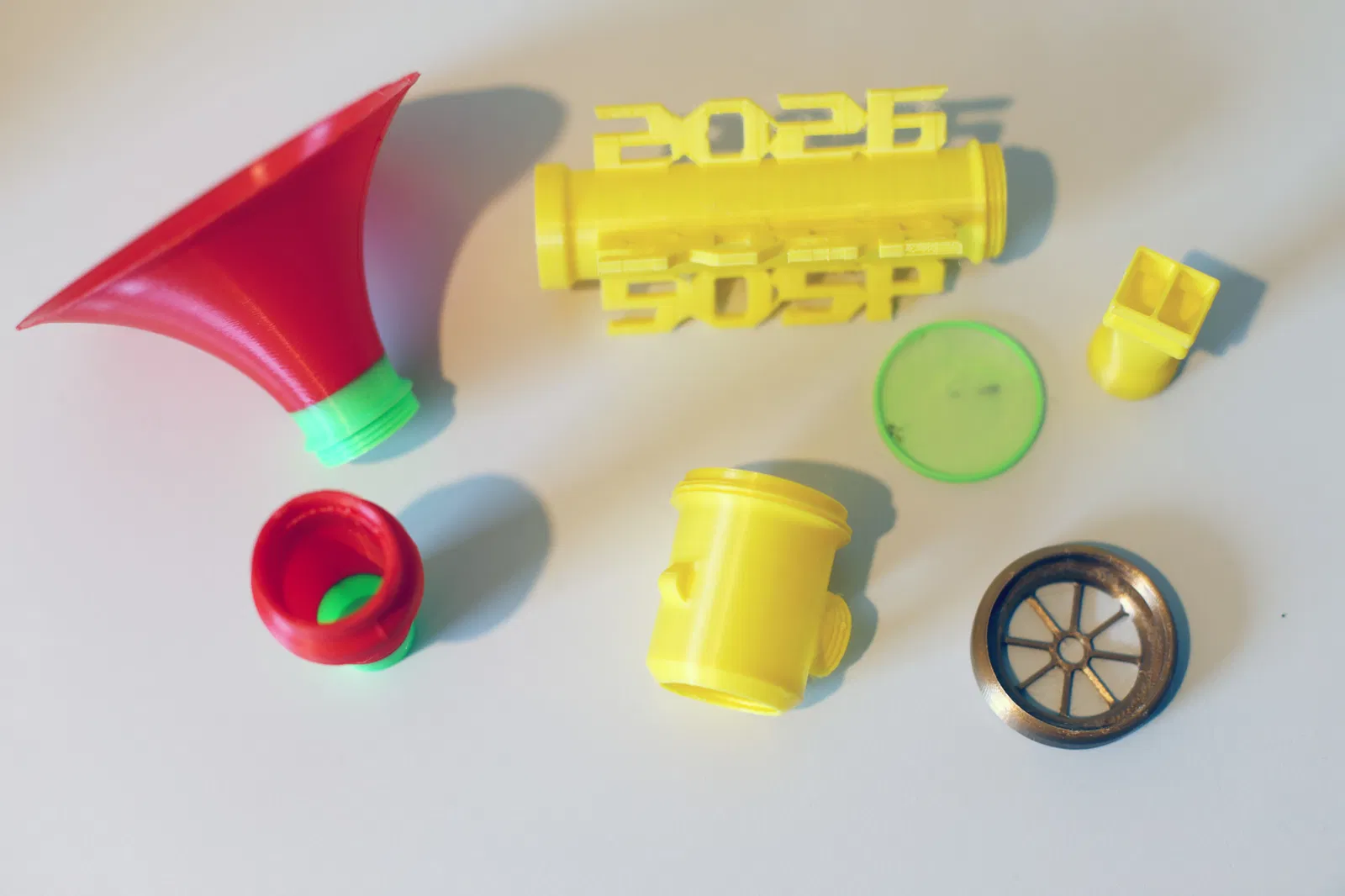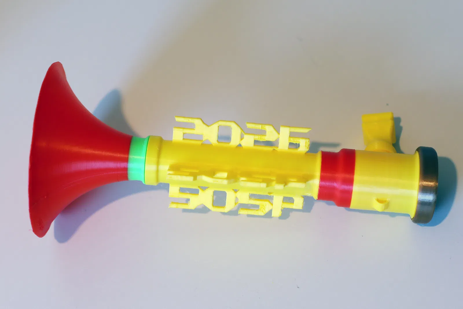 Có một bộ lựa chọn linh kiện. Phần vỏ là “Körper_außen”. Có bản có ren để gắn “Mundstück” và bản không có ren. “Körper_innen” là phần bên trong. Phần này có 2 phiên bản: đường kính đầu cộng hưởng (resonator) lớn hơn hoặc nhỏ hơn. Nhìn ở cuối tên file sẽ có “L” hoặc “S”. “Membran” có độ dày 0,2mm và 0,4mm. “Ende” cũng có nhiều hình dạng khác nhau. Ngoài ra còn có “Zwischenteil”: bản đơn giản, hoặc bản có chữ “2026” bao quanh để dùng dịp Năm Mới. “Zwischenteil_ein_Loch” có một lỗ, có thể dùng để tạo ra các âm khác nhau. Tất nhiên, bạn có thể in bản không lỗ rồi tự khoan 1 hoặc nhiều lỗ ở vị trí phù hợp. Hoặc bạn có thể lên kế hoạch tạo lỗ đúng vị trí trước bằng phần mềm.