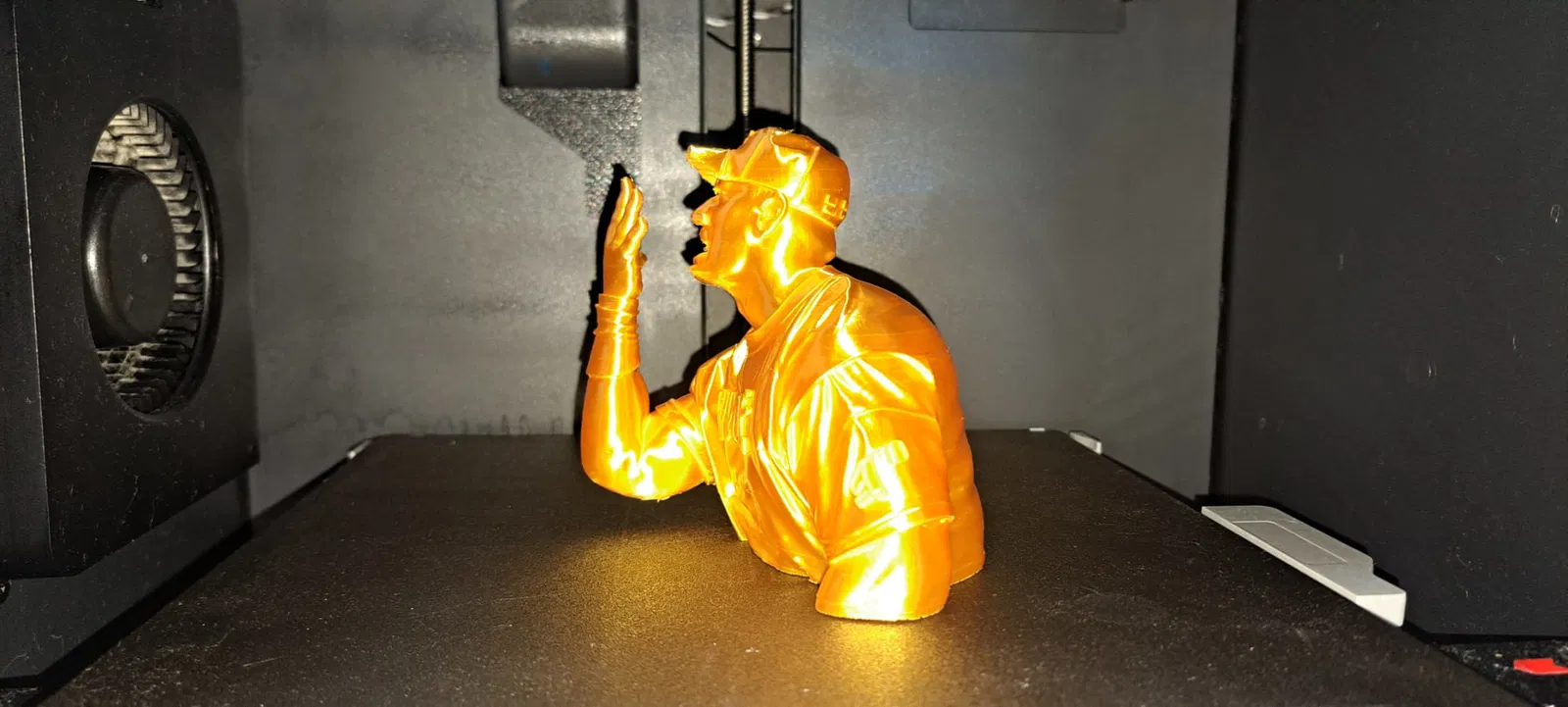 Busto JONH CENA lấy cảm hứng từ biểu tượng WWE, do Pmartins3DPrint thực hiện khi test Hitem3D (AI tạo model). In bằng Bambu Lab P1S với filament Bambu Lab Silk Gold từ CoreXY.pt cho độ bóng và chi tiết rất nổi.