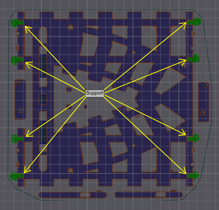 In bằng PLA, PLA+ với 4 button/top, 3 wall, 25% infill. Cần support. (xem trong hình)