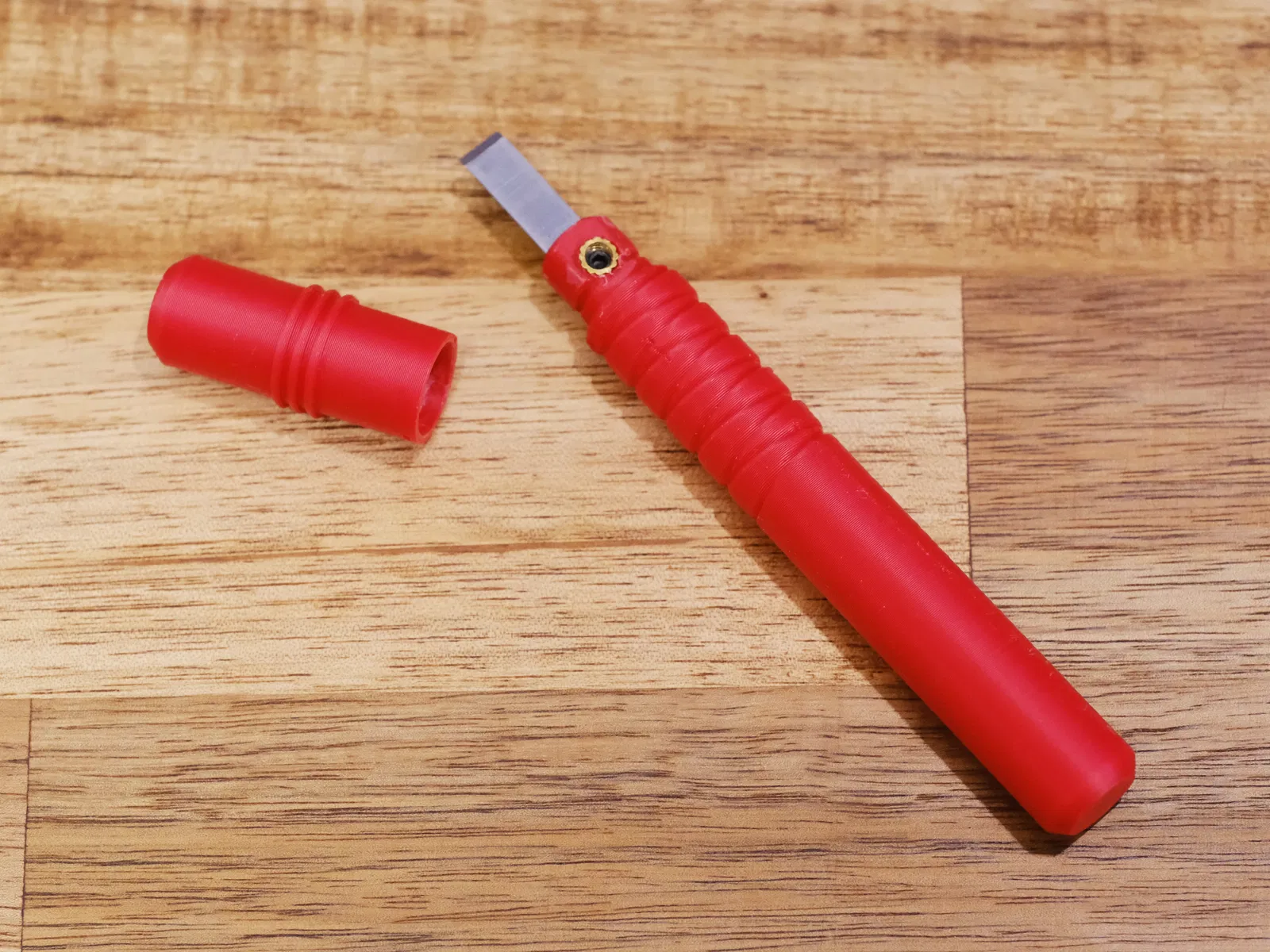 Tay cầm dao hobby thiết kế riêng, khóa lưỡi chắc bằng M3 heat-set insert và grub screw. Kèm nắp an toàn Twist-Lock có cơ chế khóa cơ khí, vừa tay, bề mặt có gân, dùng cho lưỡi bản 6mm.