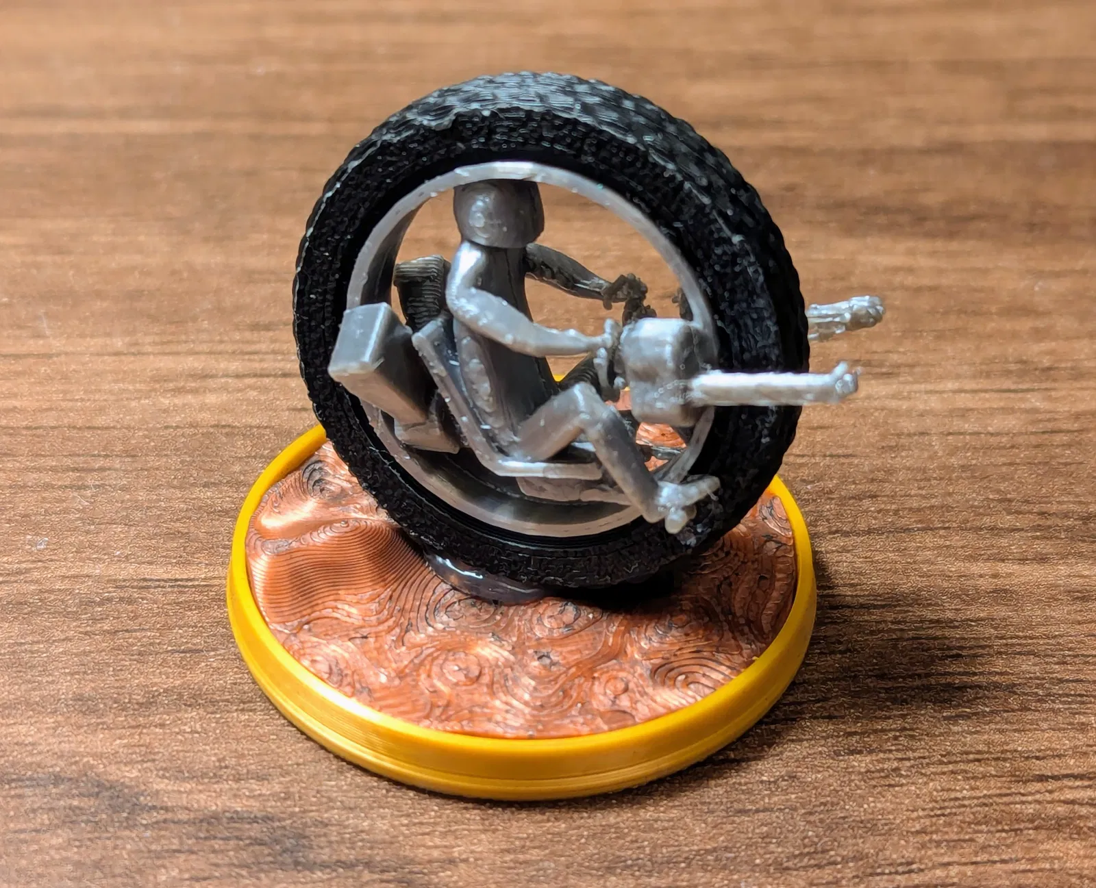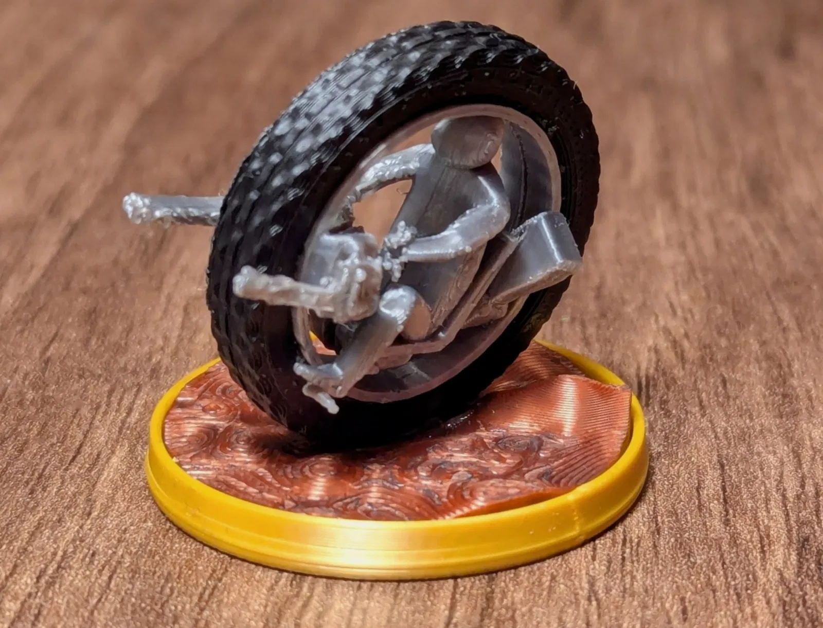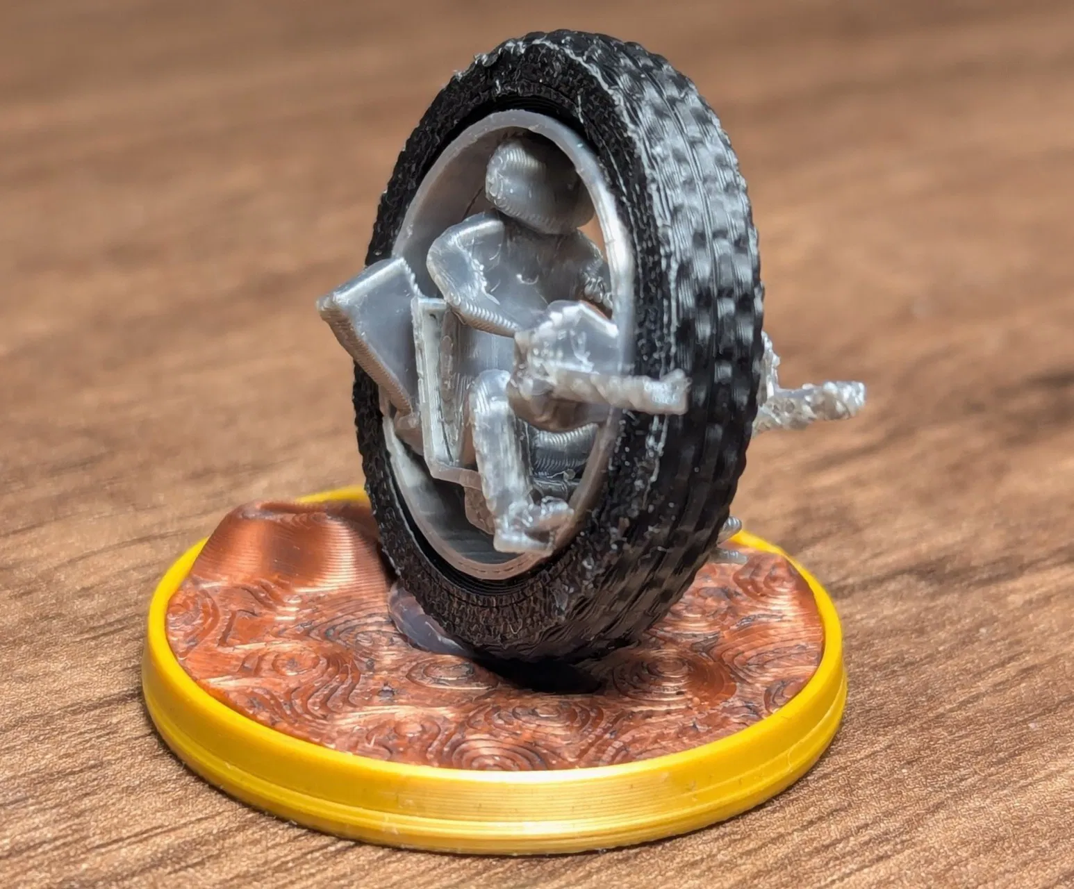 Sau khi in: Hai nửa nhân vật có thể press-fit vào trong lốp. Mài/giũa nhẹ phần vành lốp có thể sẽ dễ hơn. Nếu muốn, bạn có thể thêm chút keo để cố định hai nửa nhân vật với nhau sau khi đã đặt vào trong lốp. Dán phần “xe bánh” lên nền bằng keo là xong, sẵn sàng lao vô đường đua.