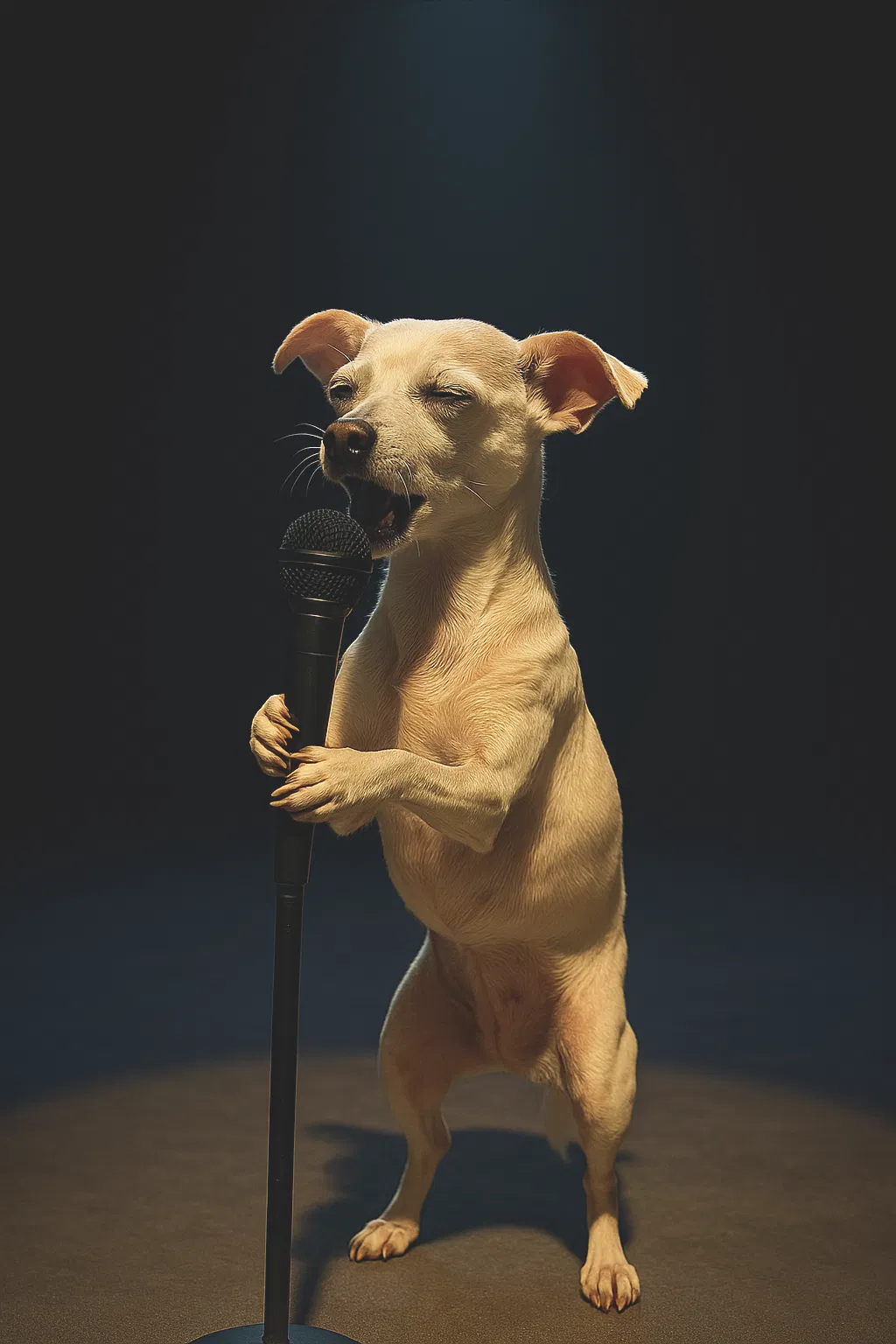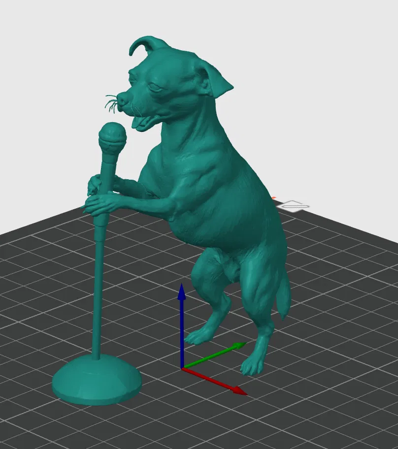 Mẫu Chihuahua đang hát vào micro, dựa trên ảnh AI về chú chó của tác giả đang trình bày một bài tình ca trên sân khấu trong club tối. Lưu ý scale nhỏ quá sẽ khó gỡ supports ở chân; phần whiskers có thể khó in.
