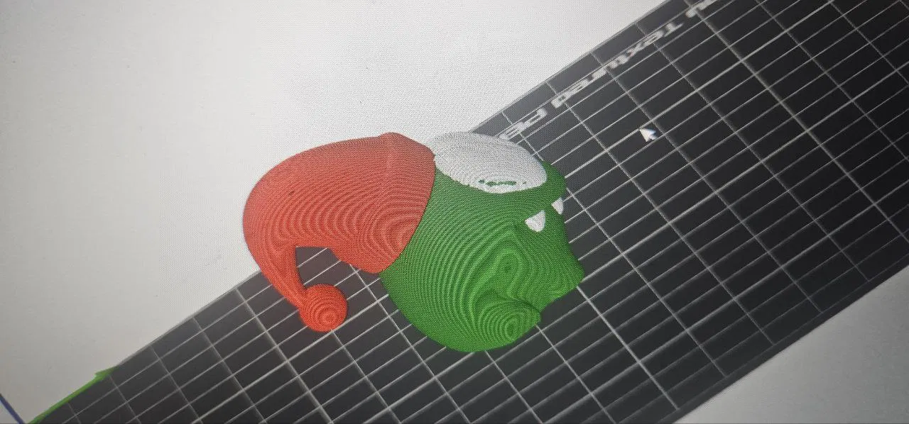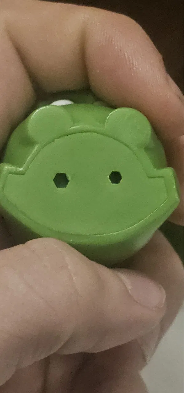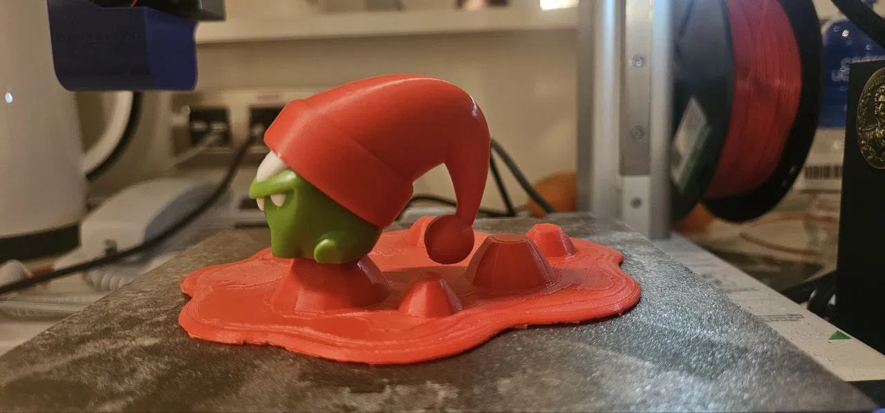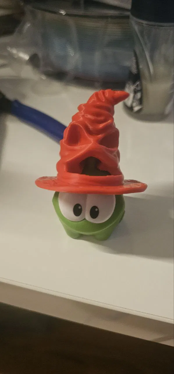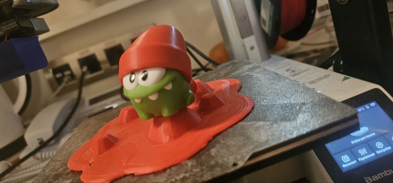 Mình mua một combo Am-Nyam (Om Nom) ở Vkusno i tochka, lúc đó còn trước Tết nên trong bộ sưu tập của họ chưa có mũ Năm Mới. Mình scan Am-Nyam rồi tự model thêm cái mũ cho bạn ấy. Mình cũng tận dụng các hình lục giác ở mặt dưới của khung, làm ra một cái mount để ai cũng có thể dùng theo ý muốn. Phần bãi cỏ thì AI model giúp mình nên nhìn không đẹp lắm))