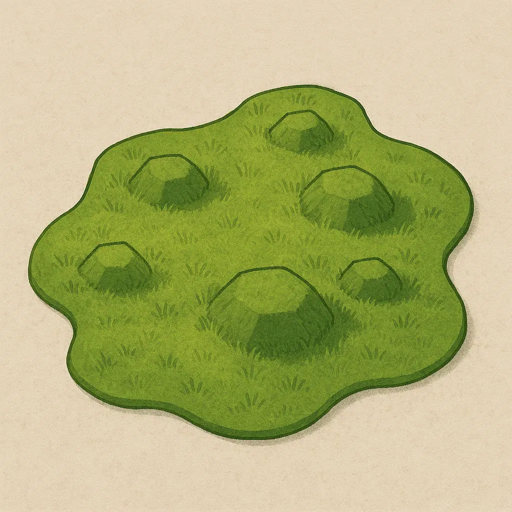 Model Am - Nyam (Om Nom) dạng đồ chơi: tác giả scan nhân vật và tự model thêm mũ Năm Mới. Có kèm mount dựa trên họa tiết lục giác ở mặt dưới khung, dễ tùy biến; bãi cỏ do AI tạo.