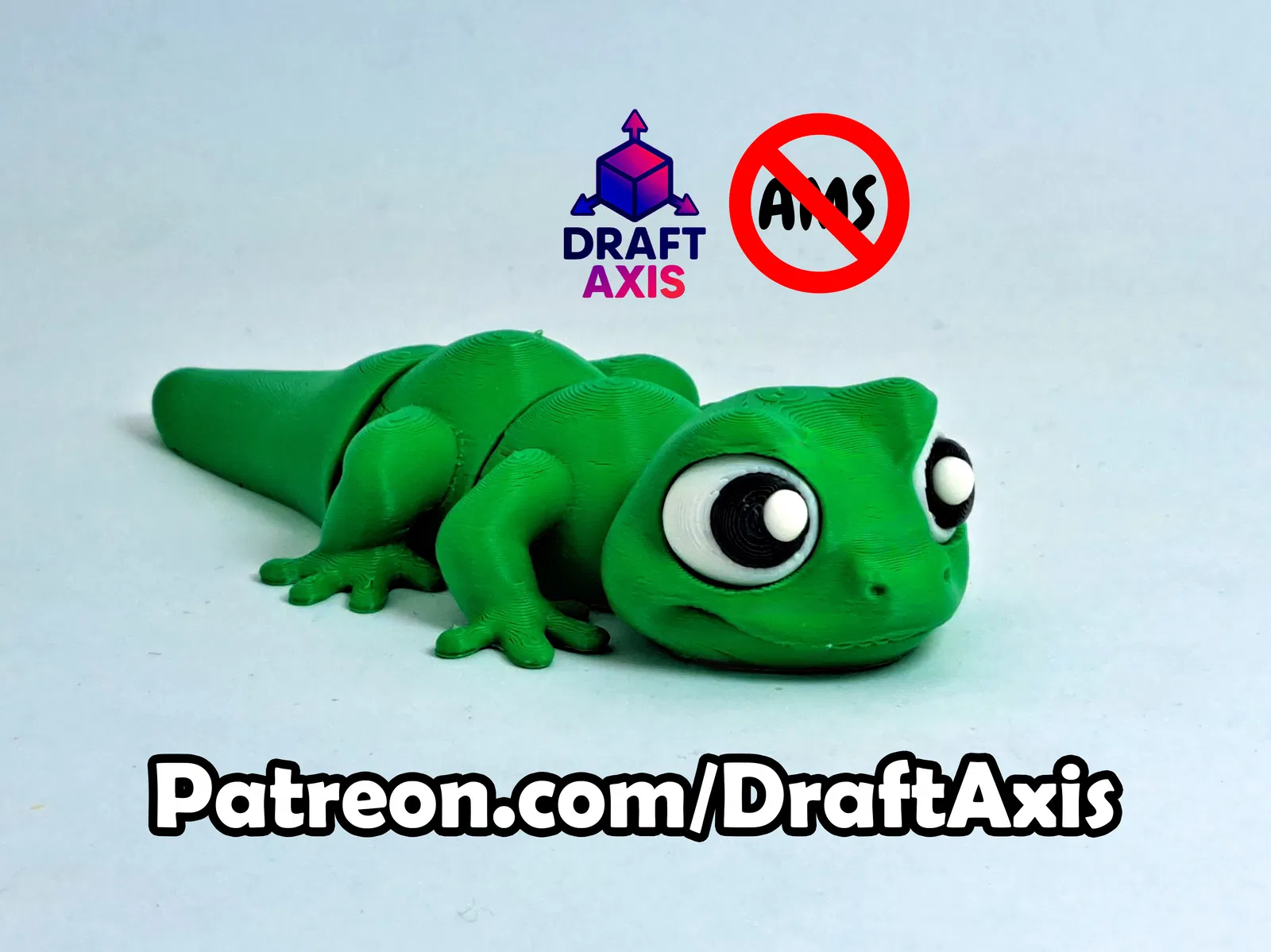 Mẫu Flexi Lizard dễ thương, in nhẹ nhàng không cần supports, không cần AMS, khớp dẻo mượt và hợp cho người mới. Có bản nguyên khối in xong dùng ngay; bản NO AMS flexi độc quyền trên Patreon.com/DraftAxis.