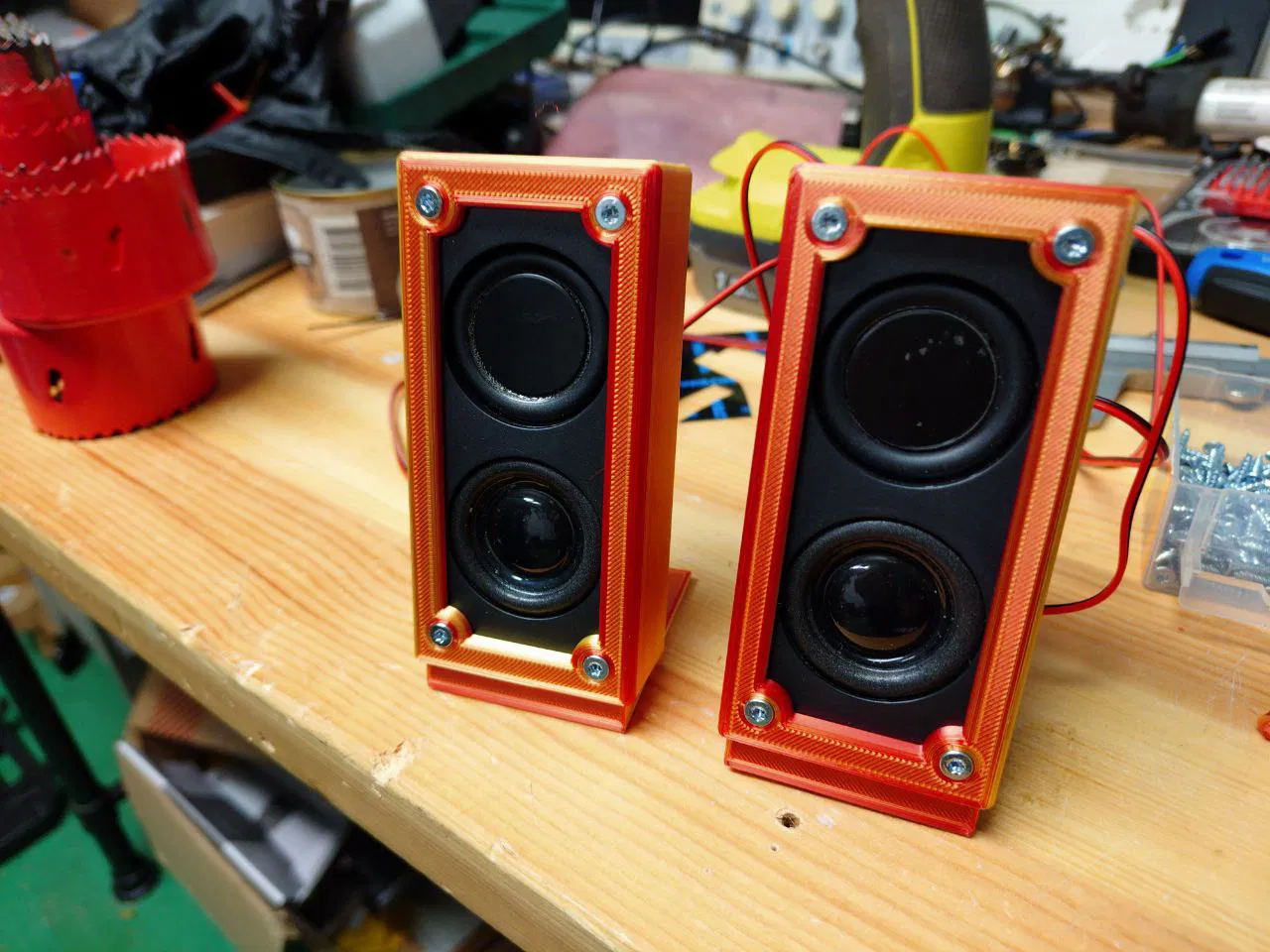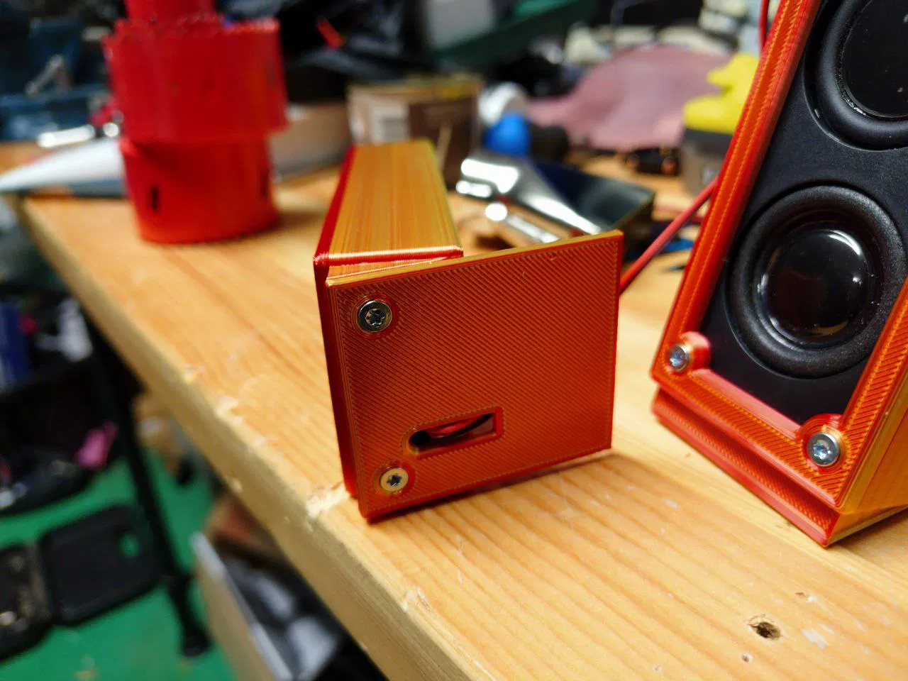 Loa có lỗ bắt vít nhưng ngoài ra không có gì khác, nên mình làm nhanh cái hộp này kèm khung viền nhìn gọn và có phần chân đế.