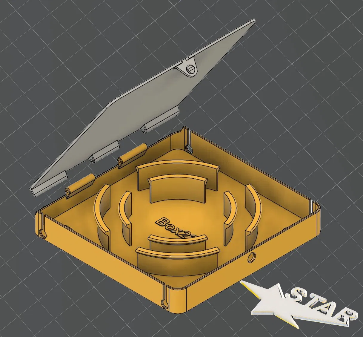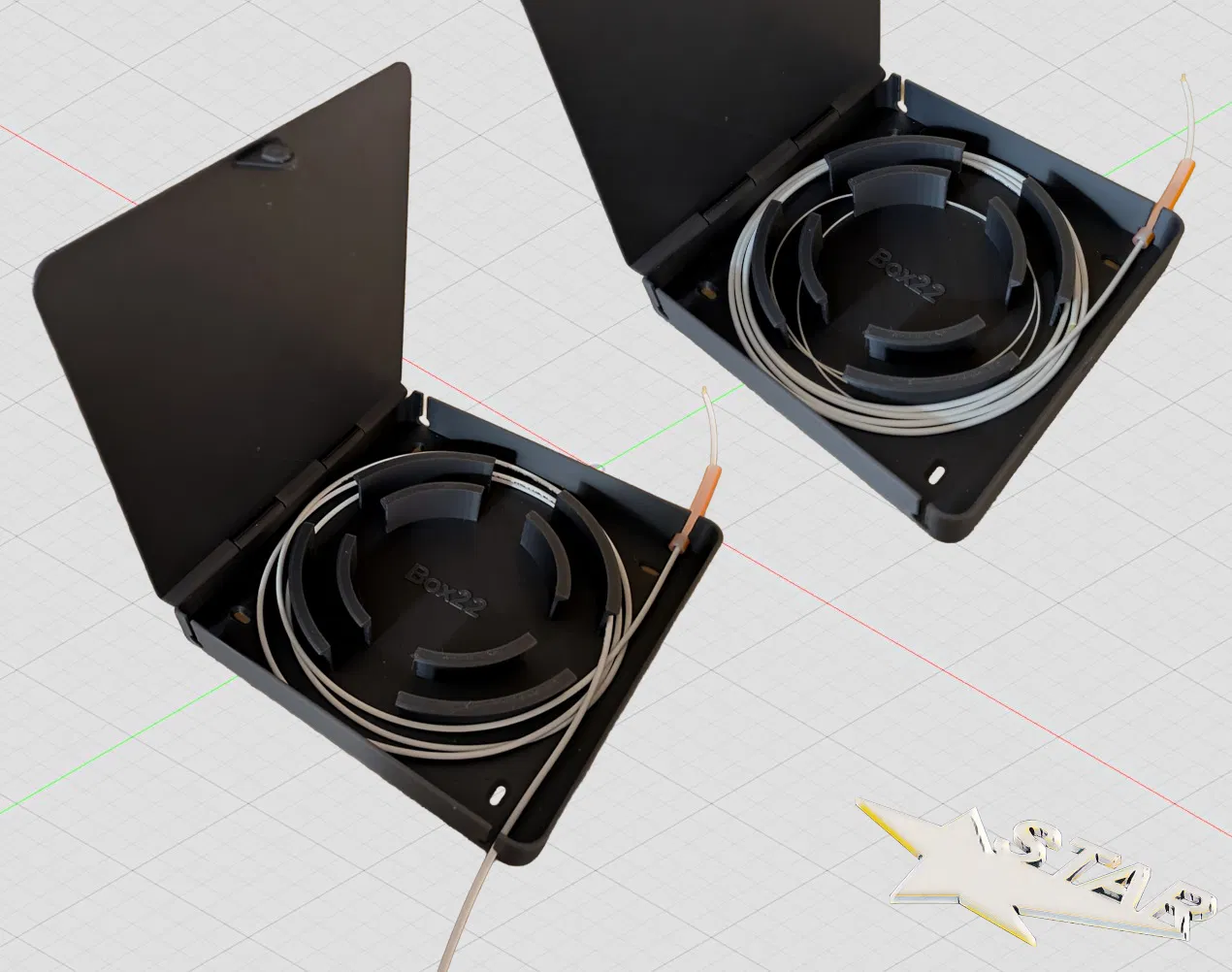 Hộp quản lý cáp quang kích thước 170×170×27 mm, nắp có bản lề. In bằng PLA+ khoảng 215 g; layer 0,2 mm, infill 40% honeycomb, 3 walls, 5 top/5 bottom, Support Tree. Chốt bản lề dùng đoạn filament.