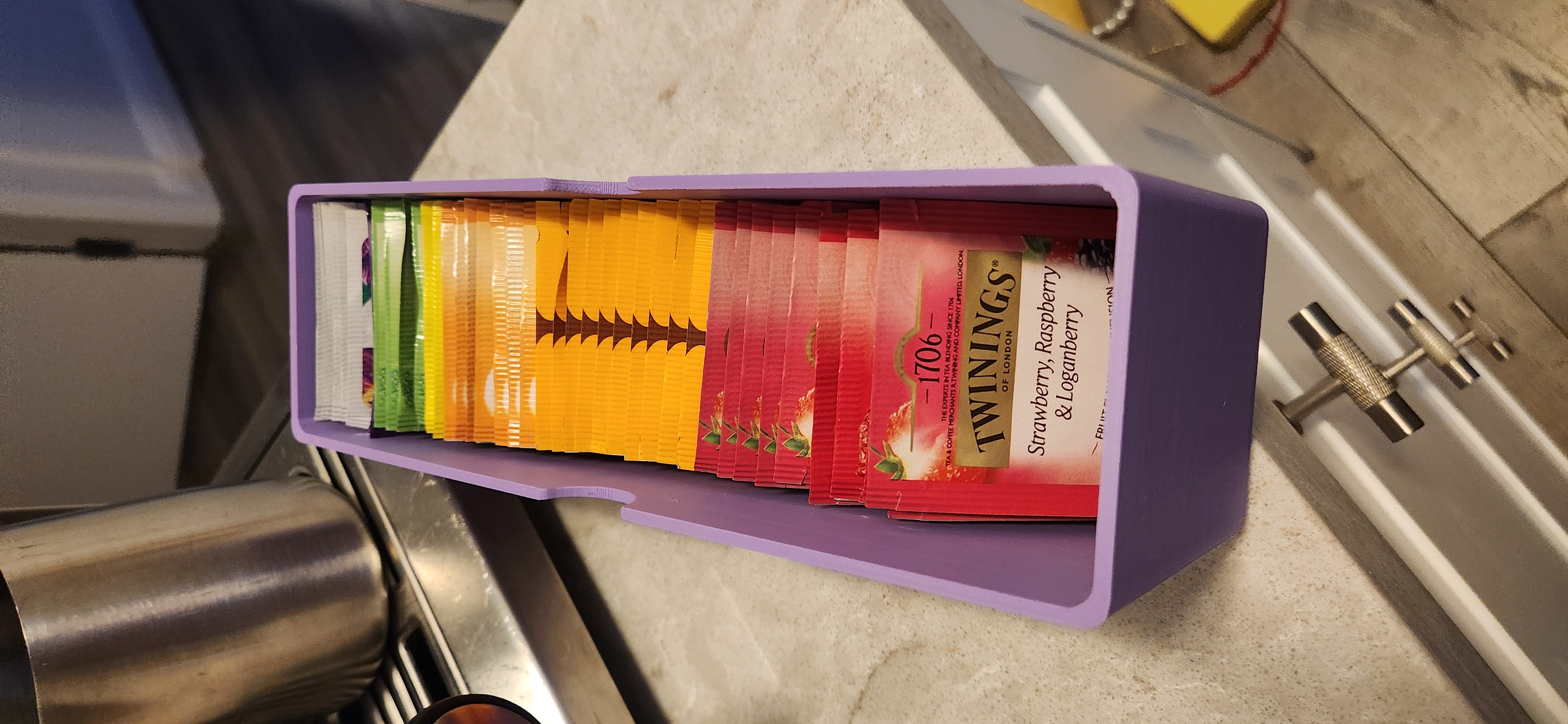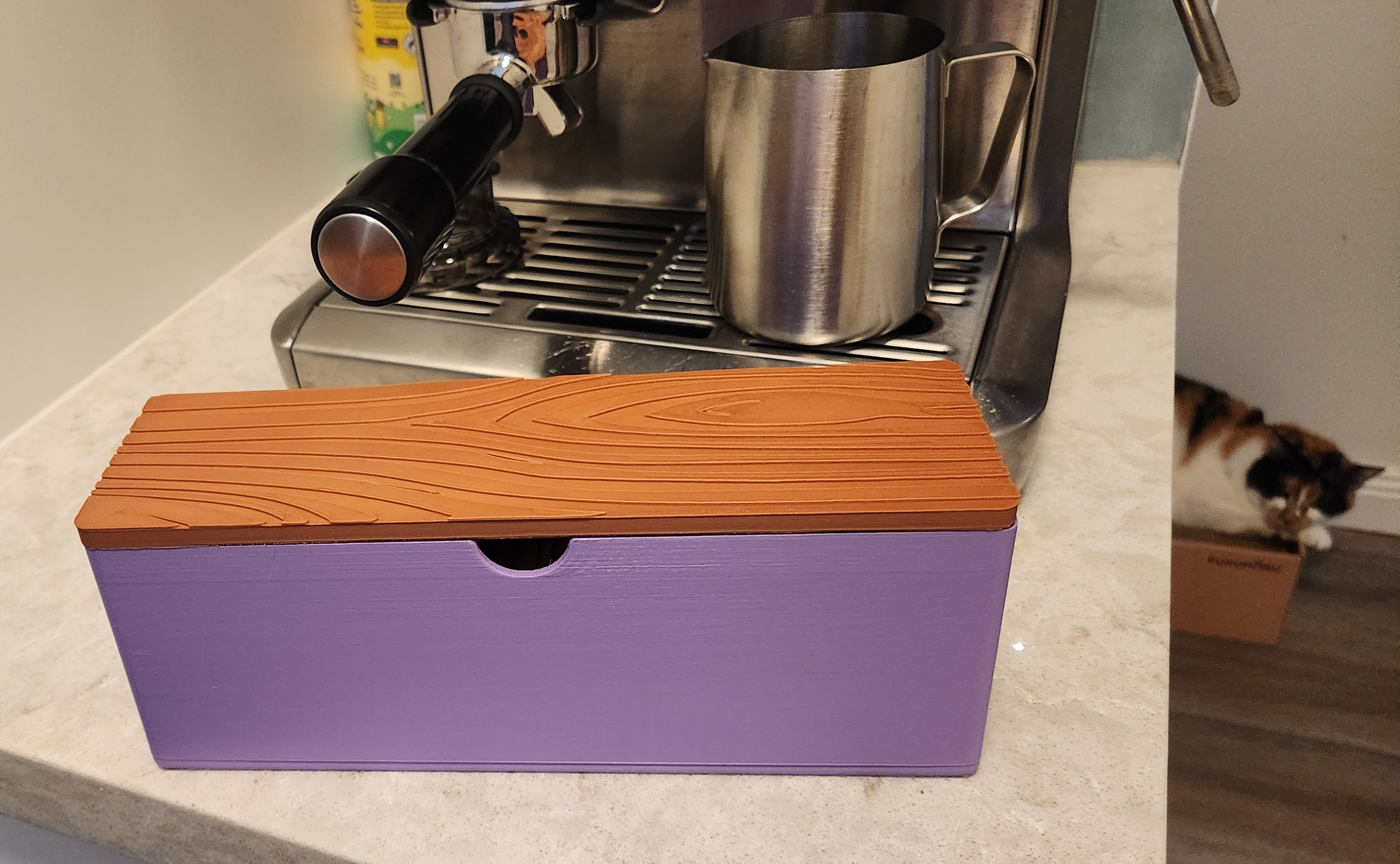 Một cái hộp để đựng túi trà, kèm nắp có hoa văn vân gỗ. Cũng có thể dùng như hộp đựng các món khác, miễn là bạn muốn một cái nắp có họa tiết vân gỗ.
