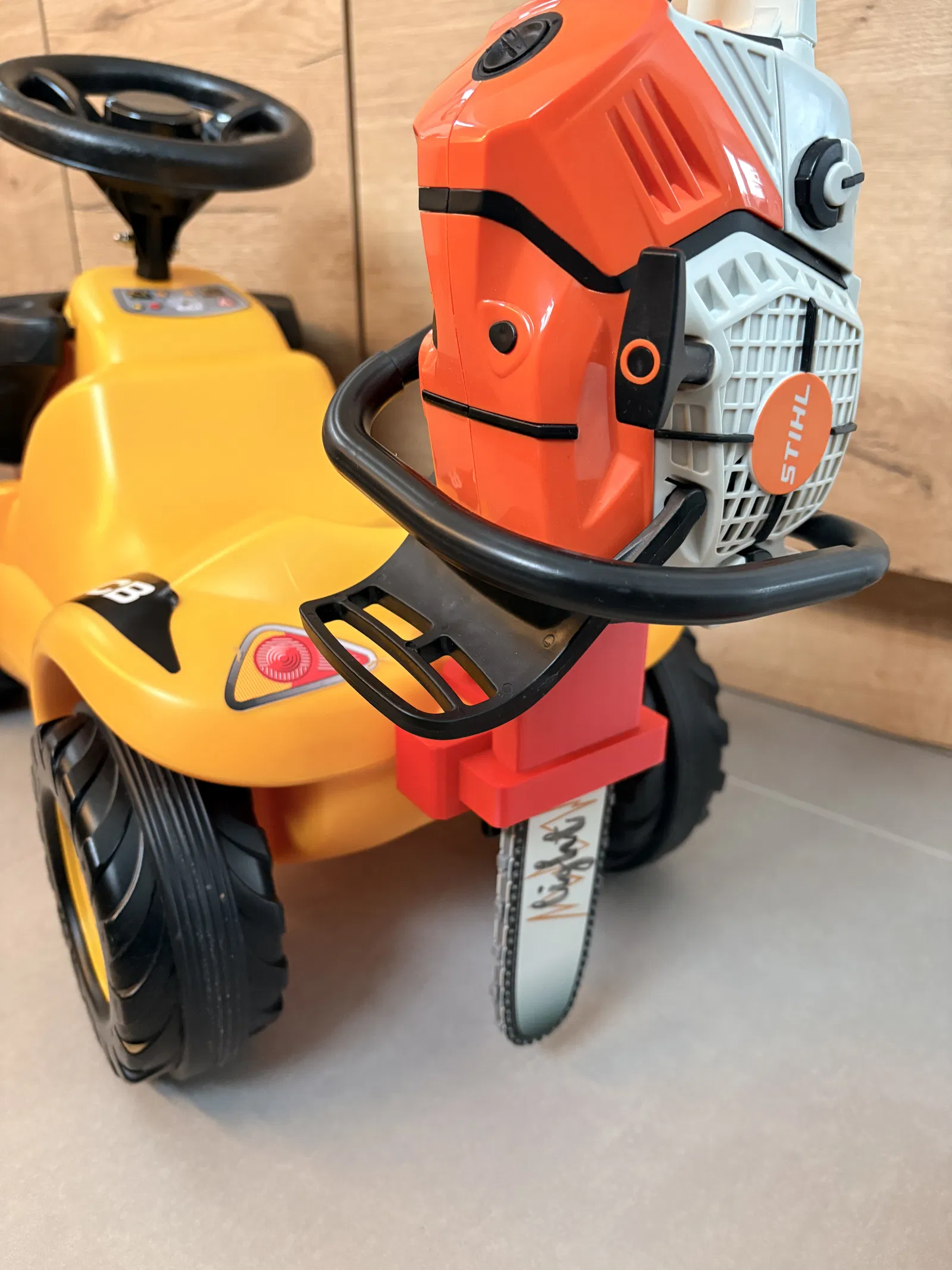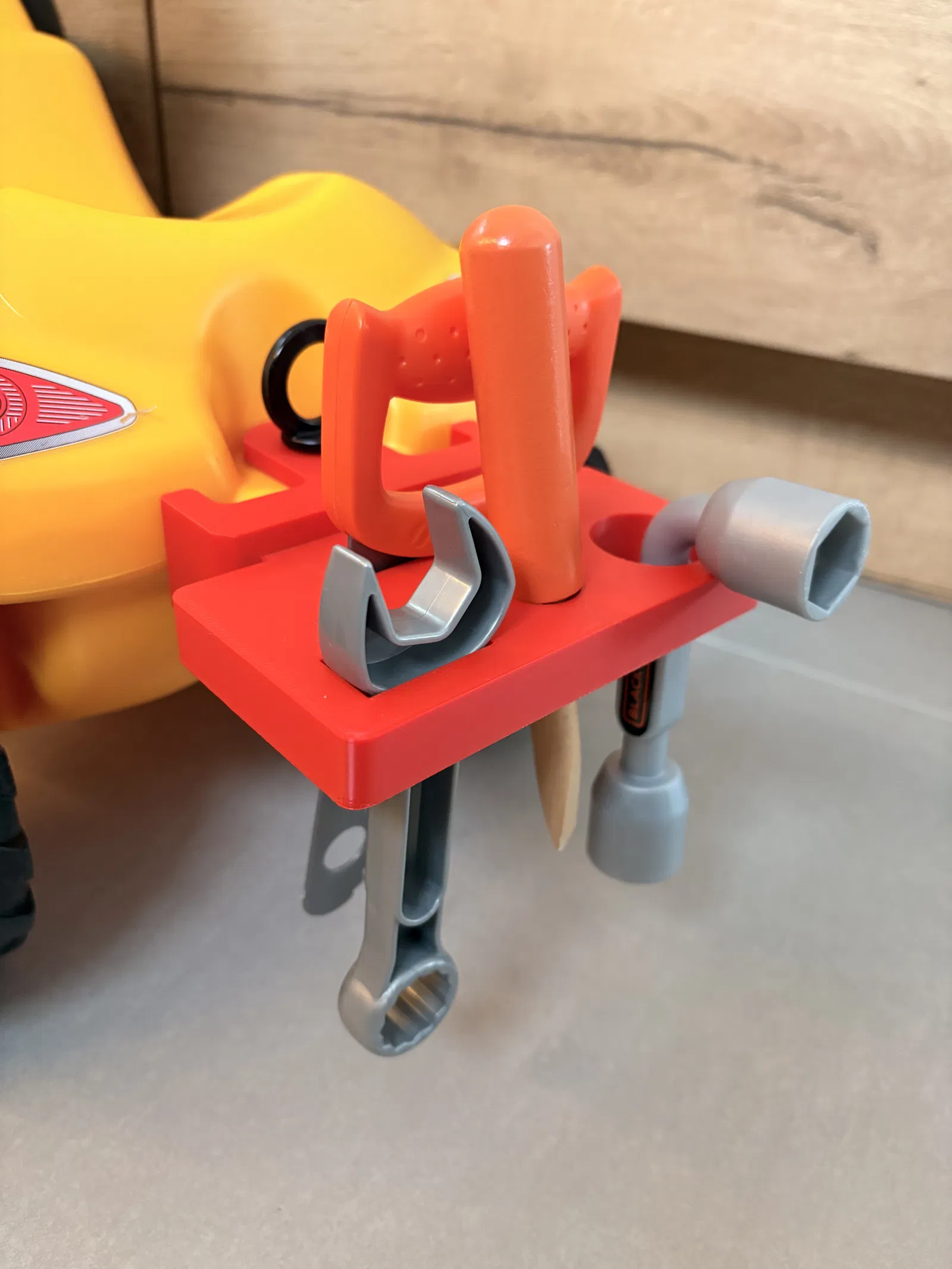 Mẫu này gồm hai phần: tấm adapter plate, chỉ cần cắm thẳng vào móc kéo (trailer hitch) của xe, và một giá/holder tương ứng để gắn dụng cụ hoặc các món đồ khác mà bé muốn mang theo. Trường hợp này, nó được dùng để chở một cái cưa xích đồ chơi hoặc vài món dụng cụ đồ chơi.