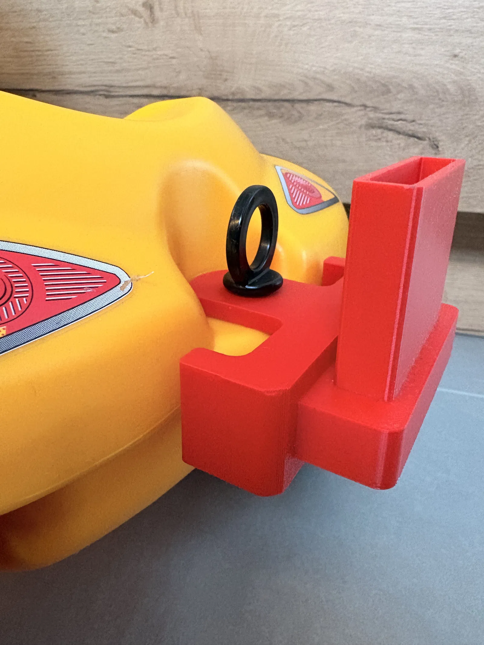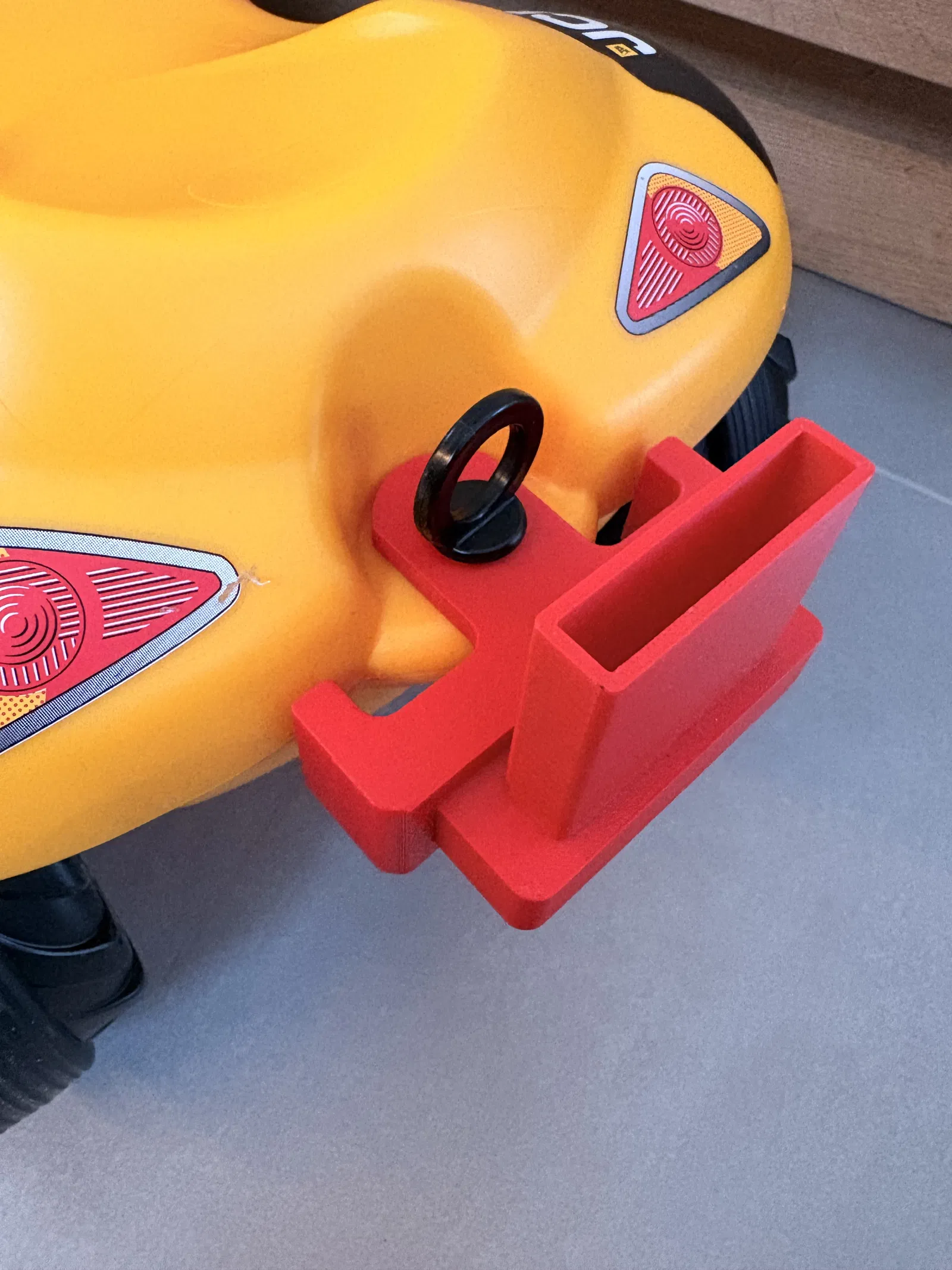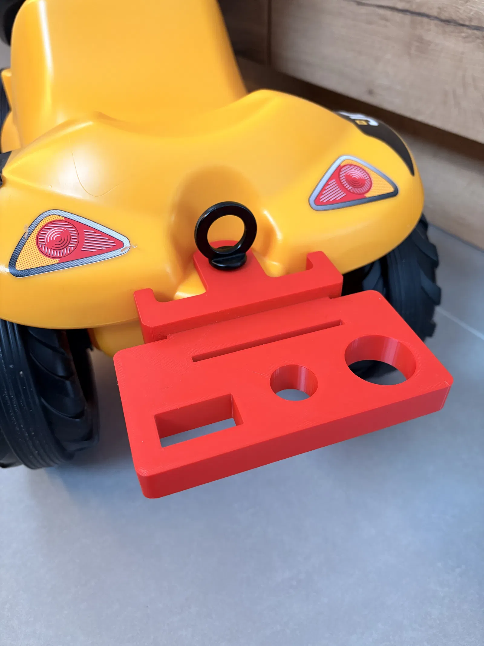 Tấm adapter plate cắm vào móc kéo (trailer hitch) của xe chòi chân Rolly Toys Minitrac, kèm holder để gắn đồ chơi/dụng cụ. Có file STEP để tự thiết kế và chỉnh tolerance. In PLA với setting tiêu chuẩn.