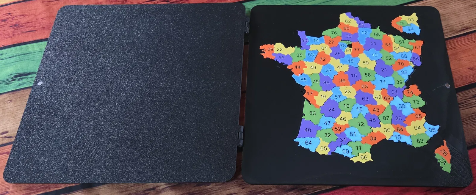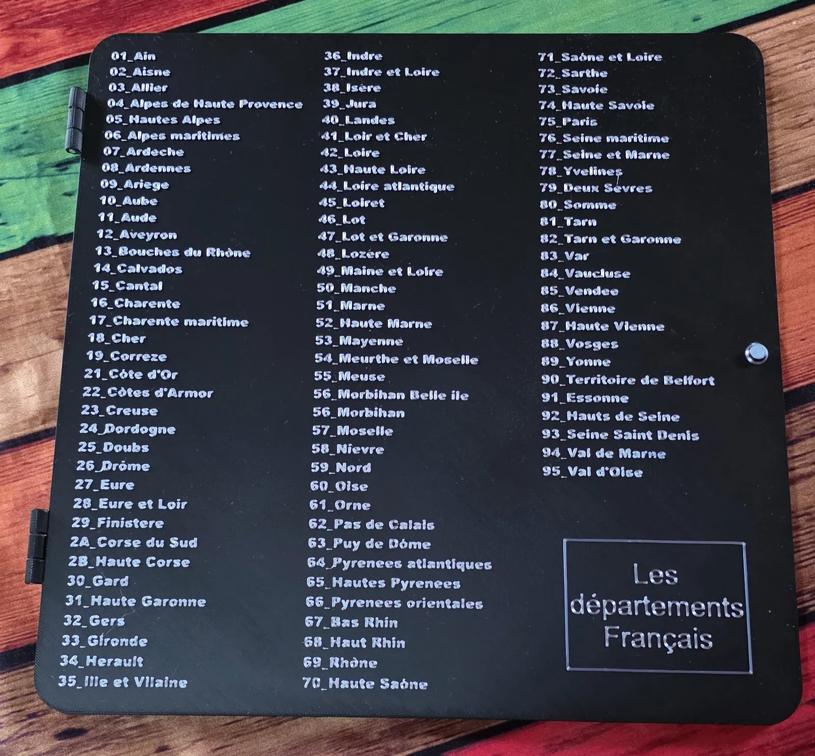 Puzzle “Departements Francais” dựa trên đồ chơi giáo dục xưa của Pháp, giúp học thuộc tên, số và vị trí các départements. Có bản “deluxe” kèm nắp khắc đối chiếu; cần 2 nam châm 3x6mm và 2 trục 3cm Ø3mm.