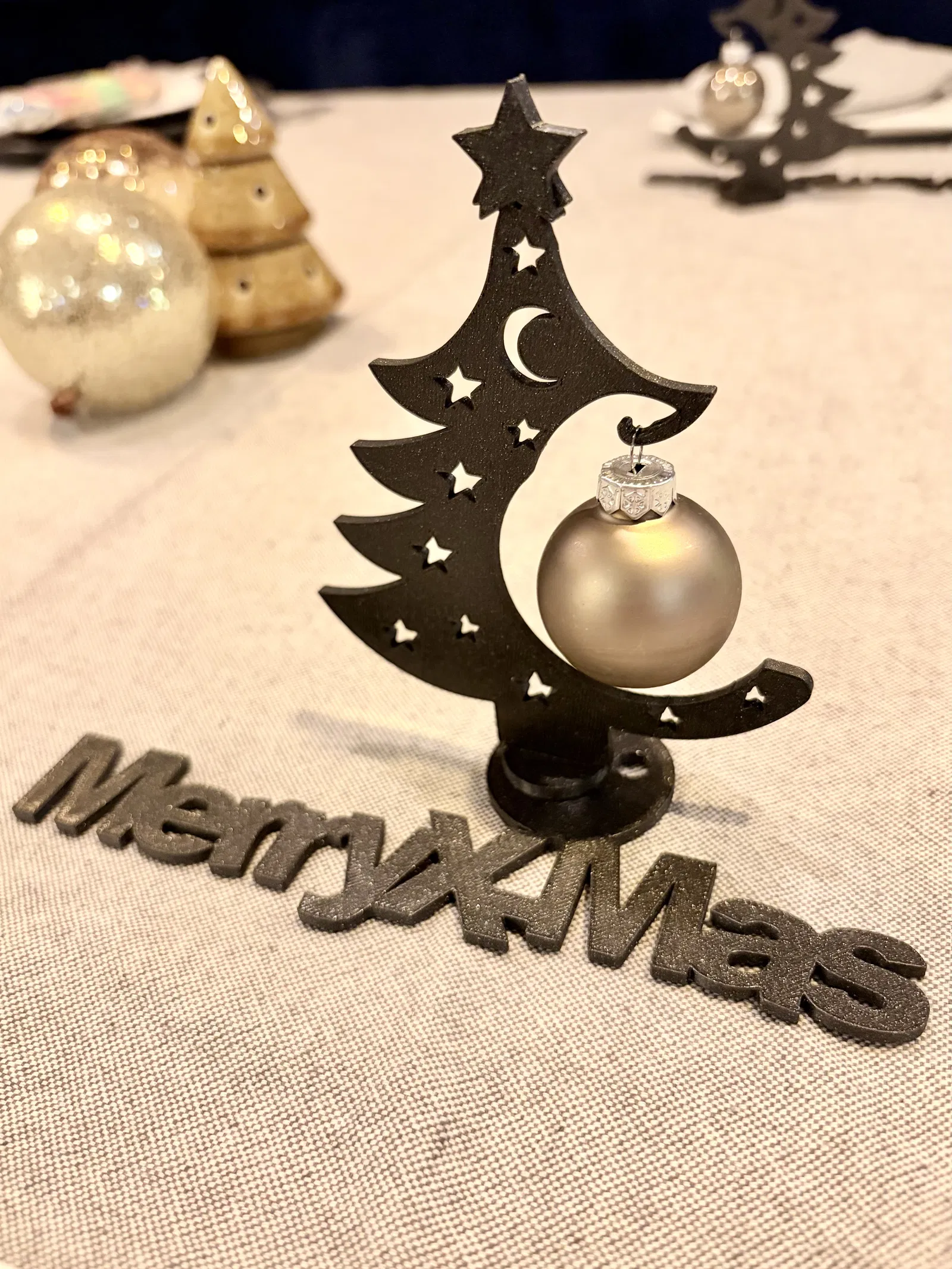 Kệ trang trí “Nice Merry X-Mas stand” đặt trên bàn dịp Giáng Sinh hoặc dùng decor. Bản remix từ 2 mẫu trên Printables: làm cây mỏng hơn, scale khớp với plate và thêm đế có khe cắm. Có bản lớn & nhỏ.
