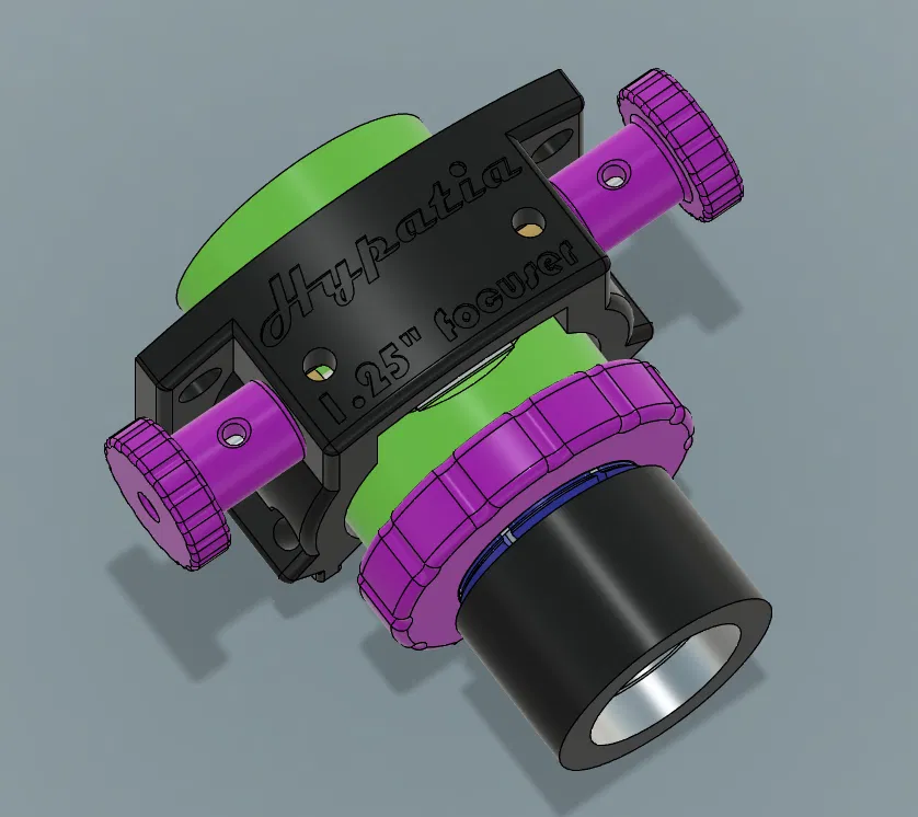 Hypatia là focuser kiểu Crayford cho hệ Hadley, dùng rollers và pinion cho thao tác lấy nét mượt, nhanh và chính xác. Drawtube in 3D có endstops, hỗ trợ collet giữ eyepiece chắc và dễ thay, thiết kế tối ưu để in không cần supports.