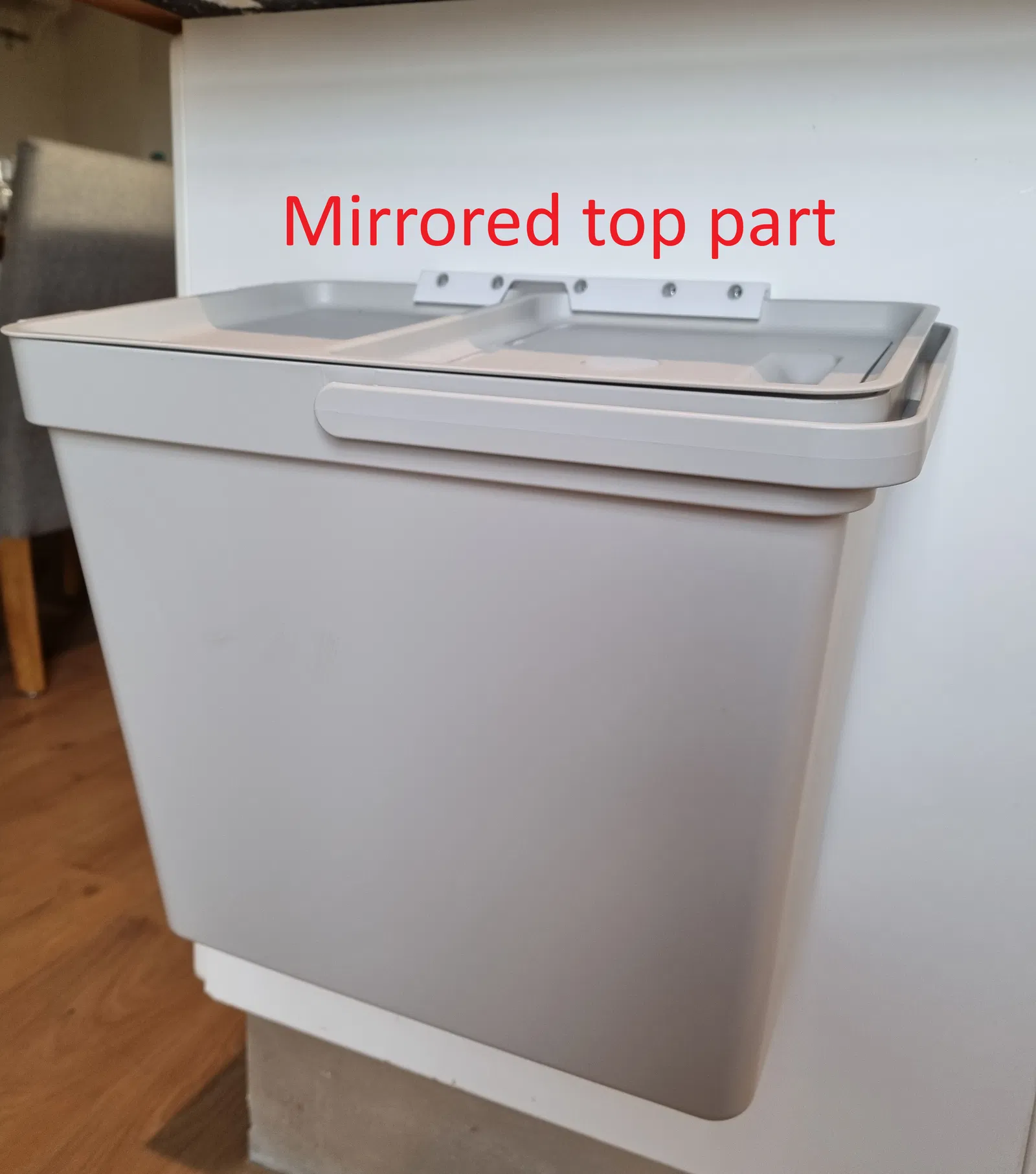 Bộ wall mount 2 mảnh cho thùng rác IKEA HALLBAR 22L, dùng để gắn bên trong cửa tủ hoặc bên ngoài tủ. Hướng mở nắp phụ thuộc bản gốc/mirror; in dựng đứng để đạt độ bền tốt và lắp bằng vít 3.5mm.