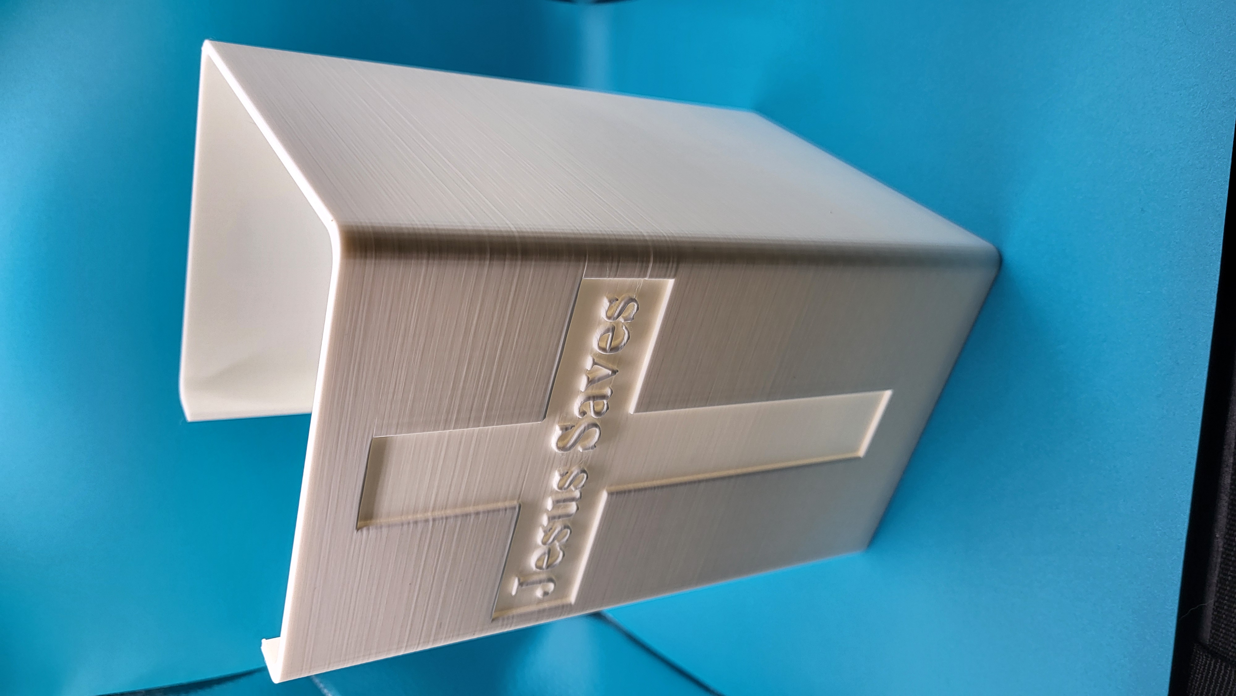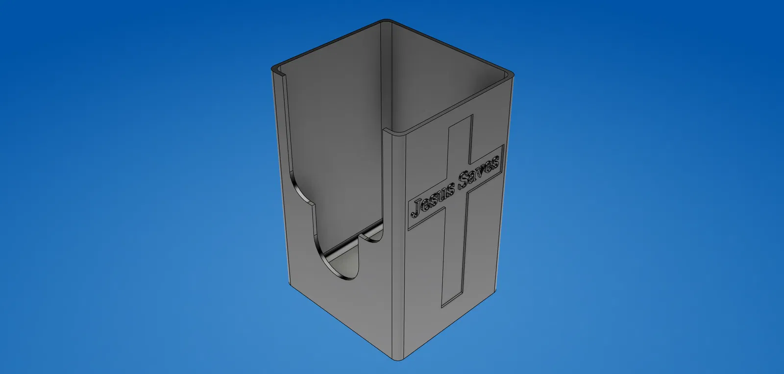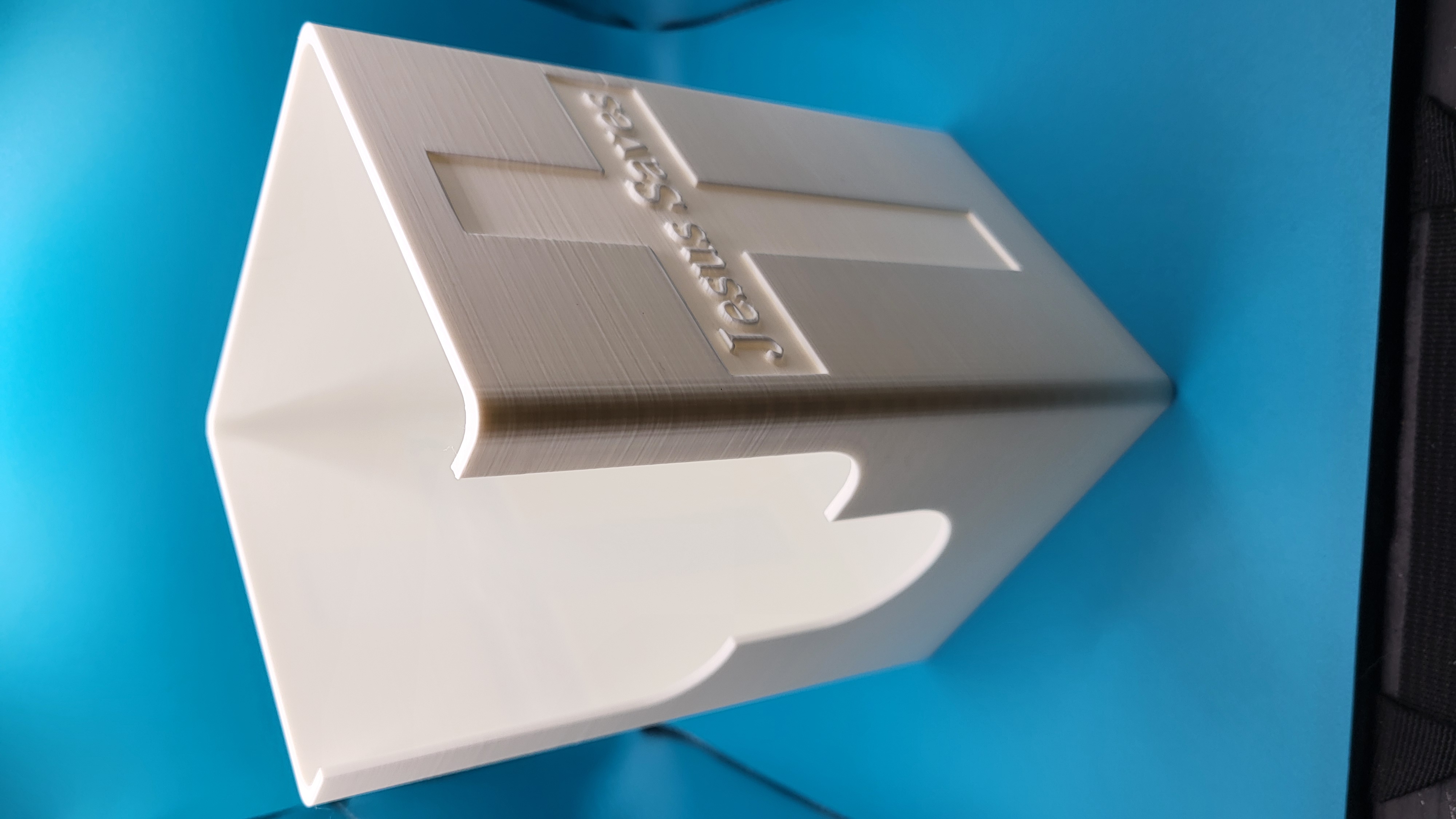 Tissue box holder - Mẫu này được thiết kế để dựng hộp khăn giấy theo cạnh hẹp, giúp tiết kiệm diện tích. Thành vách dày .125" (trừ phần thánh giá chìm/recessed crucifix dày .0625"). Với infill Gyroid 15%, thành phẩm nặng khoảng 300g.