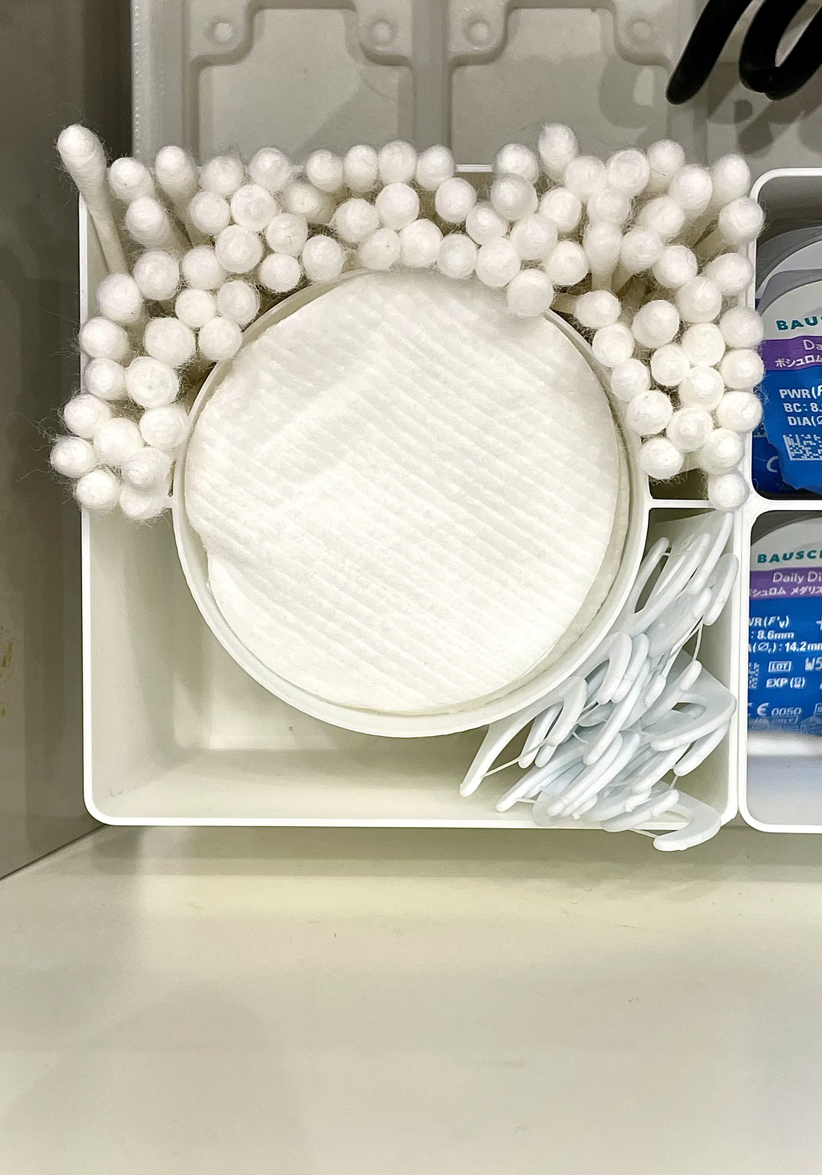 • Vách ngăn tích hợp: Cho phép lưu trữ riêng biệt bông tẩy trang, tăm bông và các vật dụng vệ sinh khác