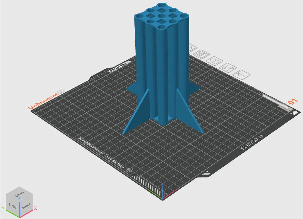 Bệ đứng an toàn dùng làm giá phóng cho 9 quả pháo rakete dịp Silvester/Năm Mới. Đã được test đêm 31.12.25–01.01.26 và hoạt động rất ổn. In PLA, rửa nước nhẹ vẫn không hư; có thể in vật liệu khác.