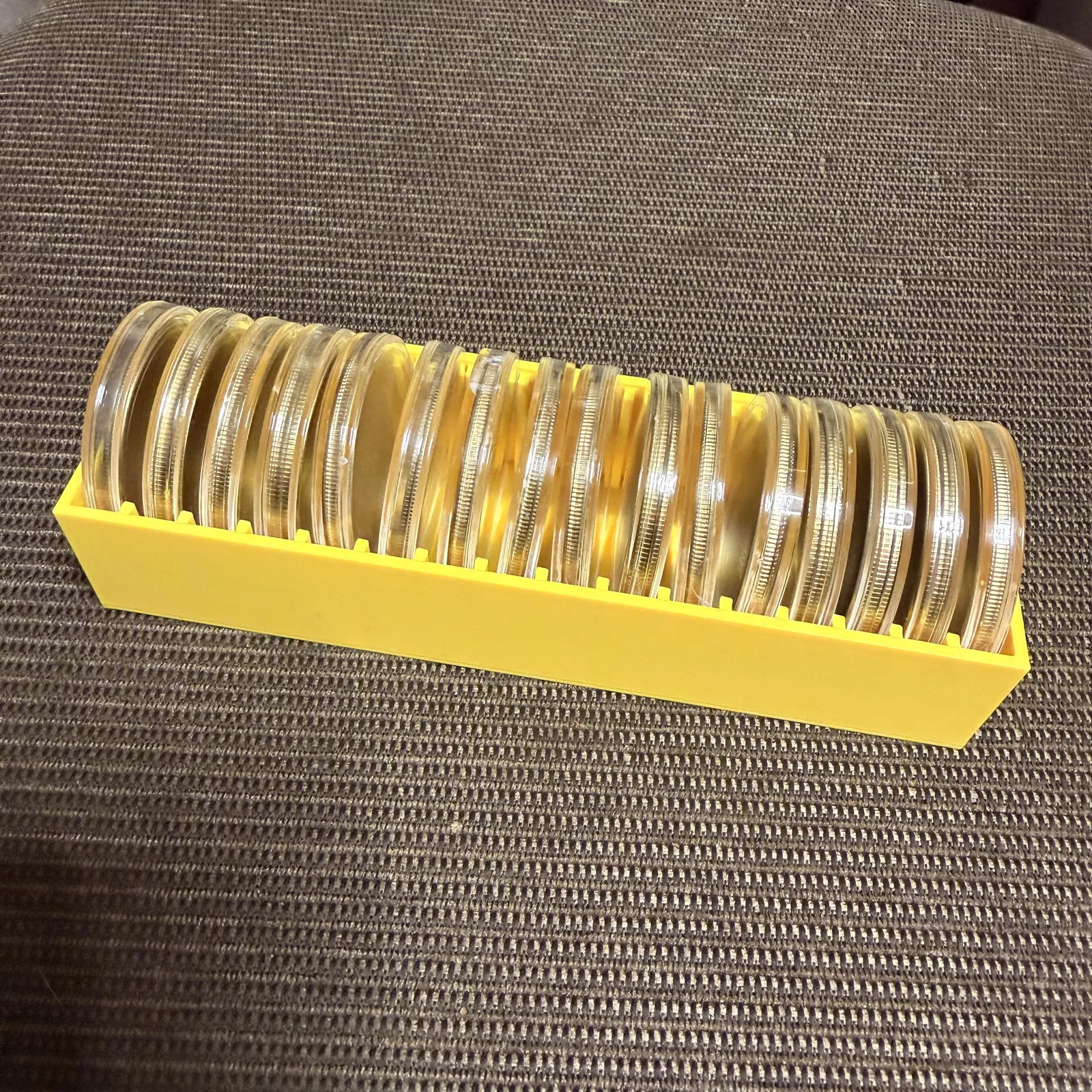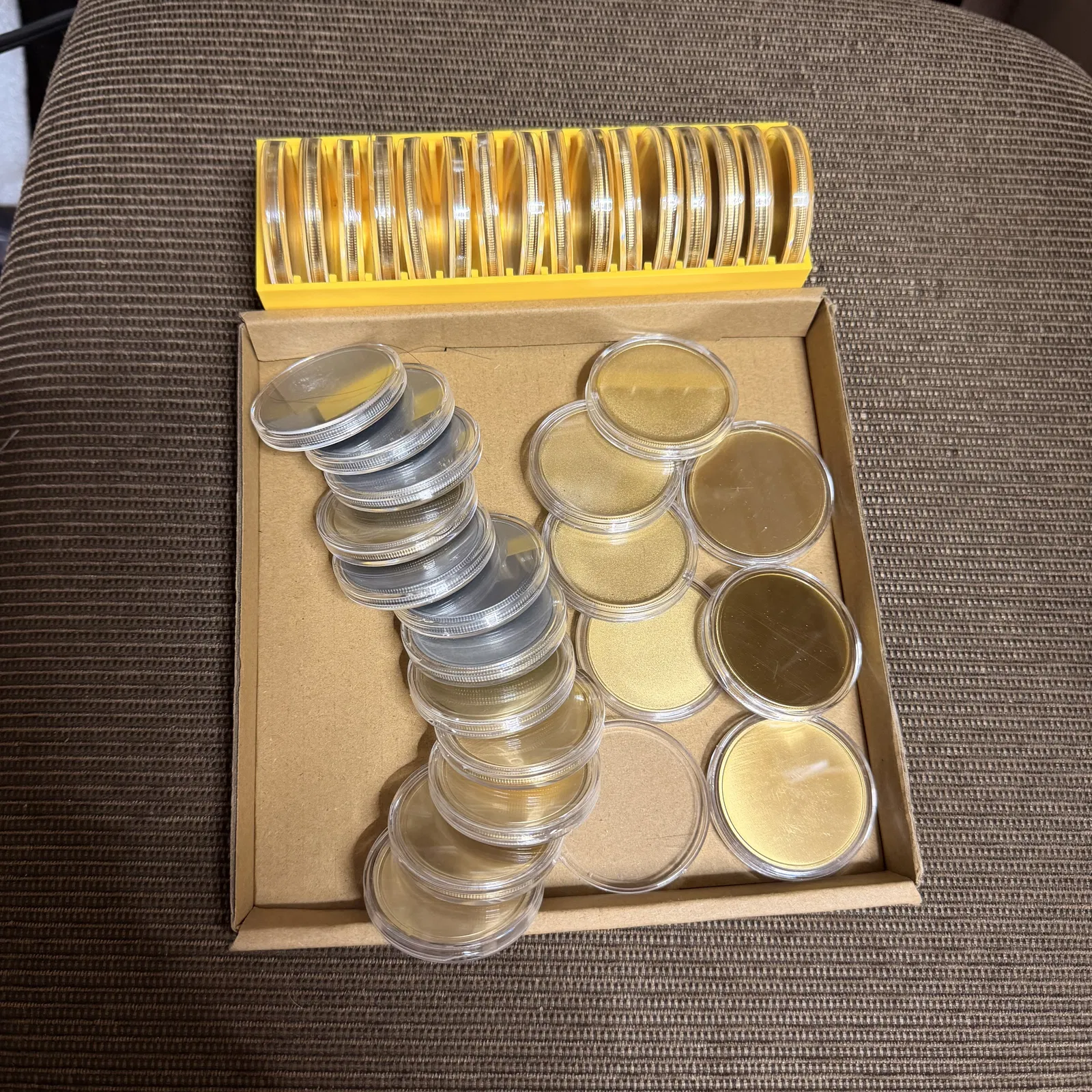 Xem hình trước và sau của mình. Mình có nhiều phôi coin blank 40 mm dùng để làm challenge coin khắc/emboss bằng laser. Trước giờ sắp xếp khá khó cho tới khi mình làm cái này. Đây là dự án 3D đầu tiên của mình. Mẫu này chứa được 16 đồng coin kèm capsule của chúng. Hy vọng bạn thấy nó hữu ích.