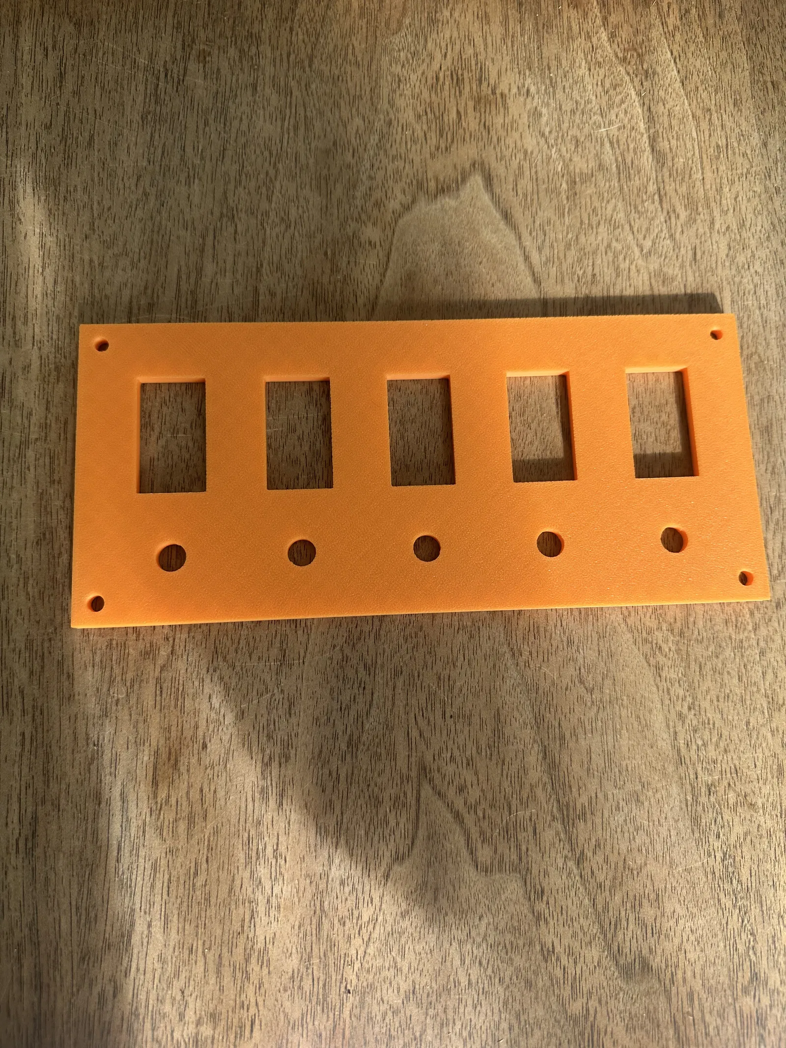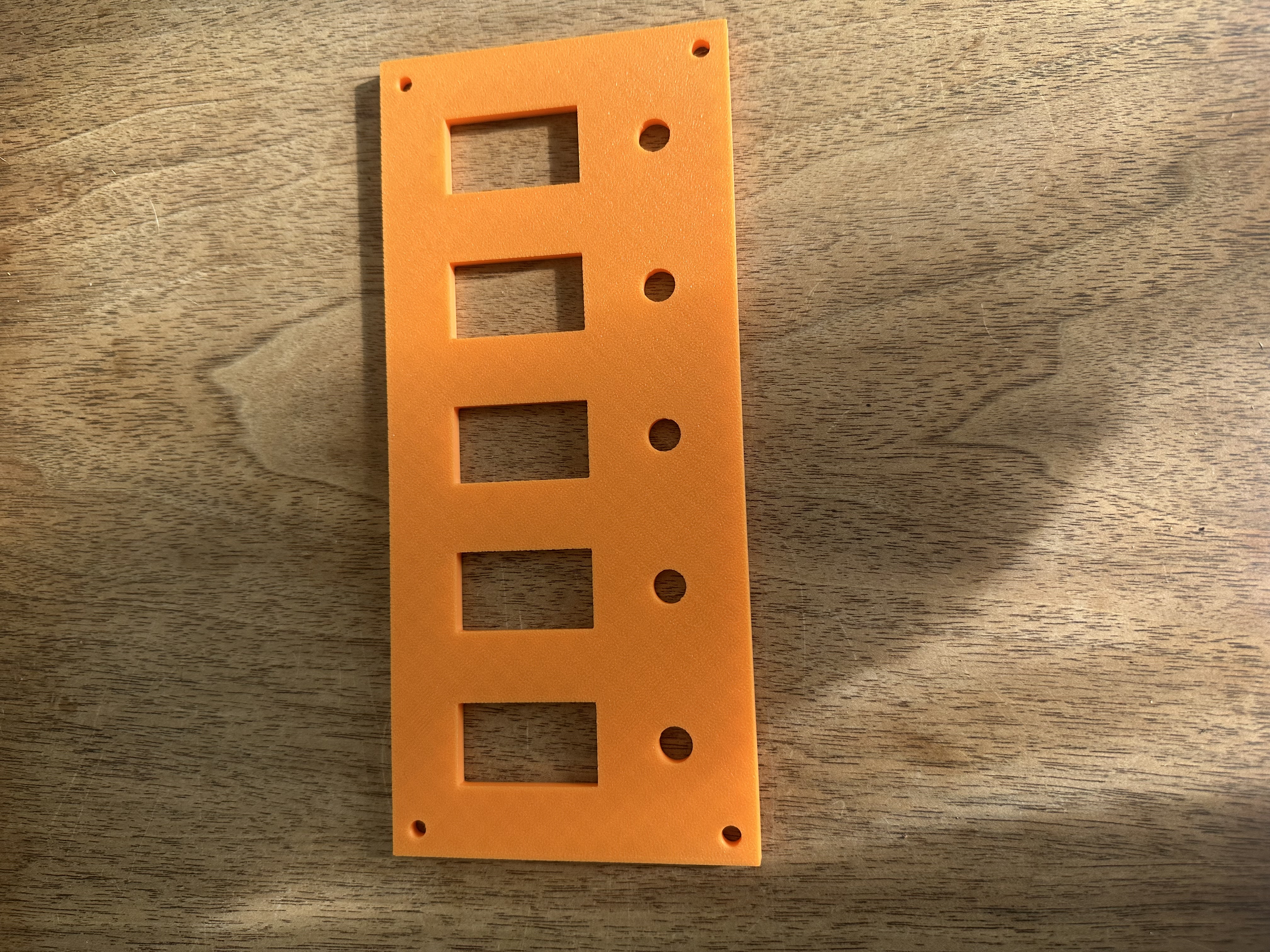 Đây là thiết kế của tui về một bảng công tắc bật tắt 5 băng, với kích thước được thiết lập cho công tắc bật tắt hàng hải kiểu Carling, kích thước 21mm x 37mm. Bao gồm cả các lỗ để thêm bộ ngắt mạch dạng nút nhấn (10mm). Cái này tui in thử bằng PLA, nhưng mà dùng ASA thì sẽ tốt hơn vì nó có lợi về UV. Tui đề xuất mọi người chỉnh cài đặt in của mình sao cho phù hợp với mức độ khắc nghiệt của việc câu cá/đi thuyền của mình, để chịu được cả những chuyến đi biển xa bờ đầy vinh quang hay những ngày thảnh thơi trên hồ.